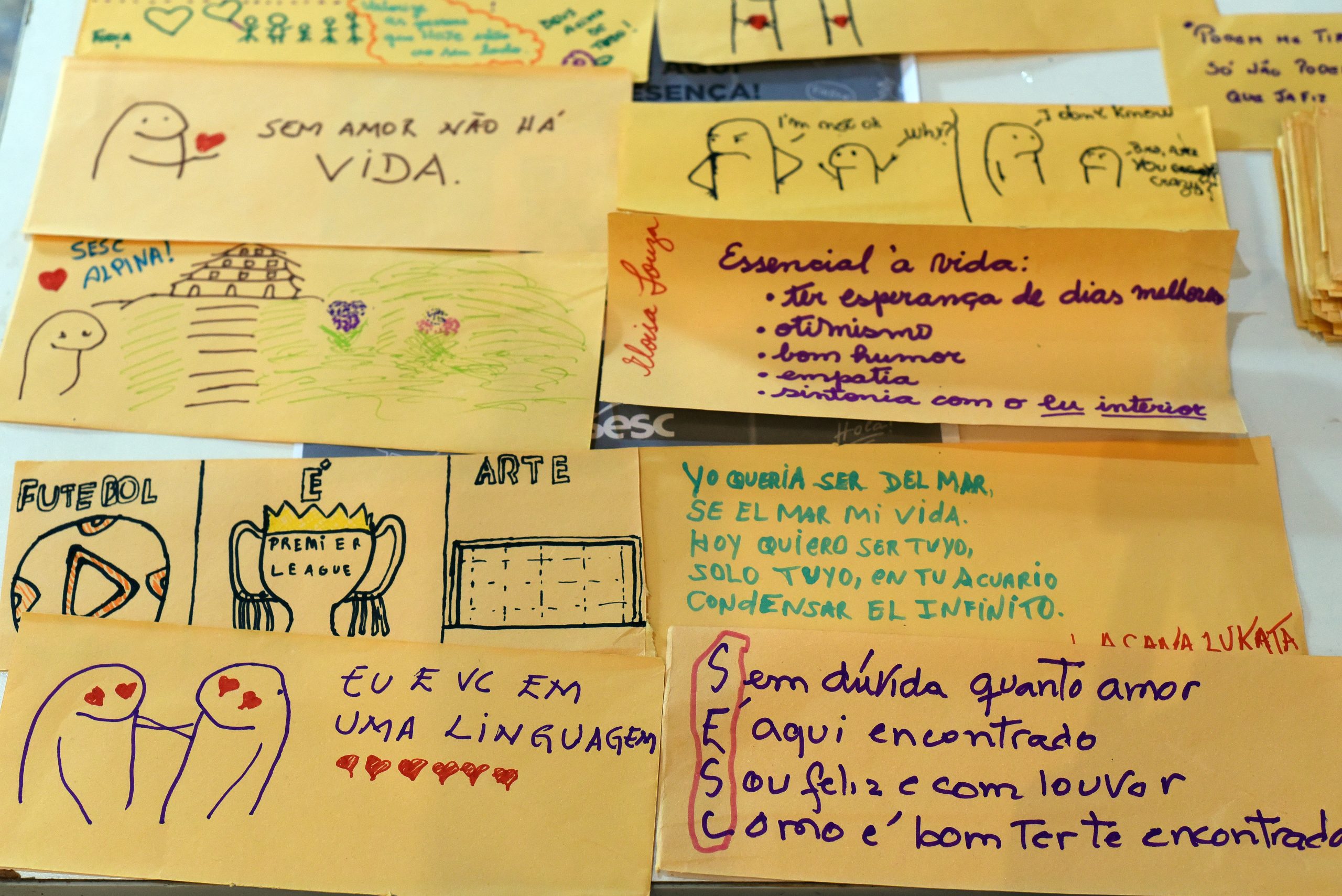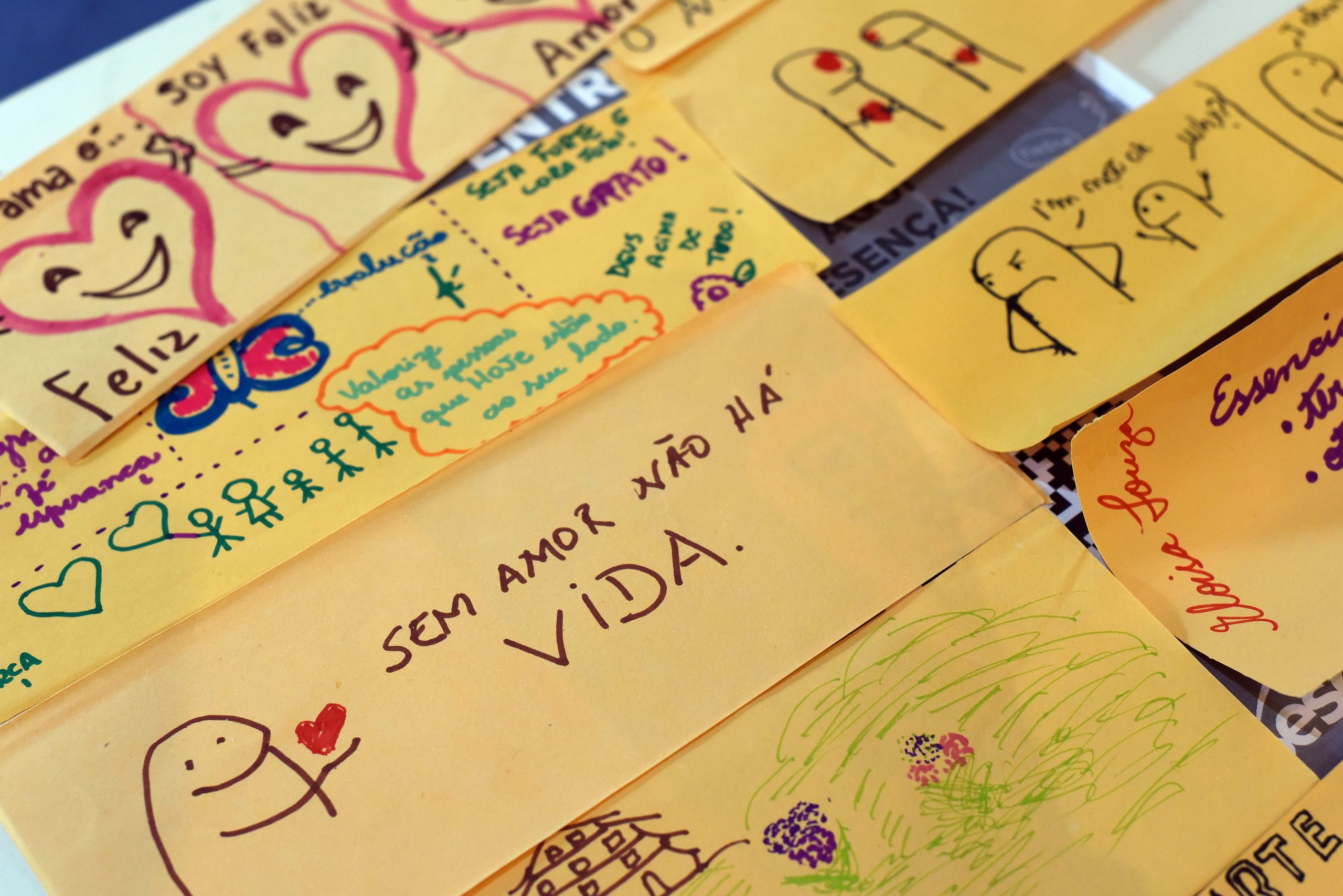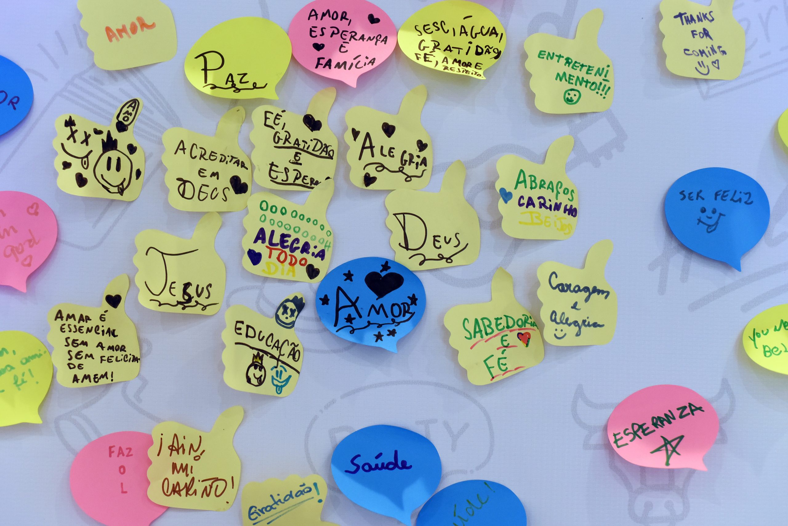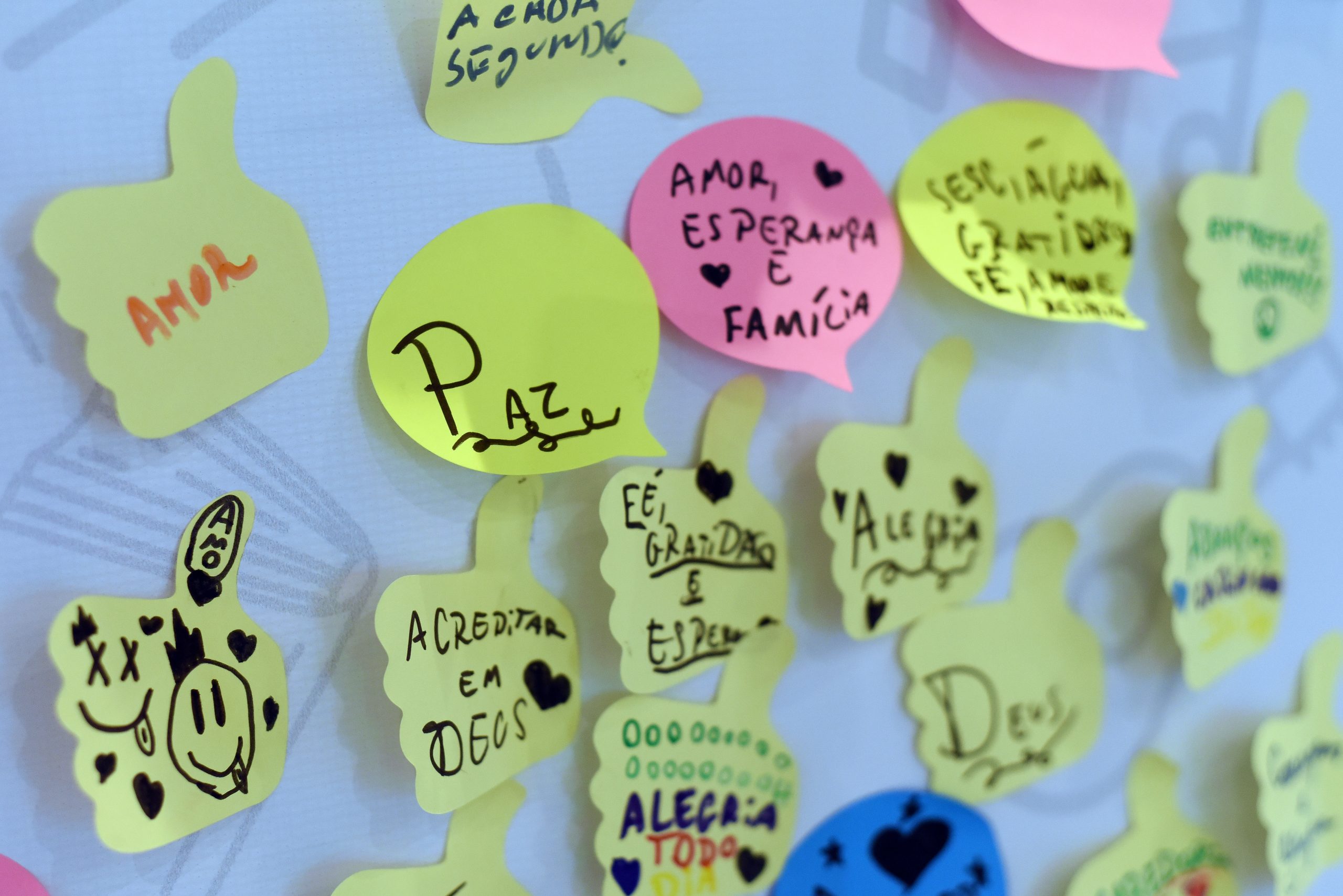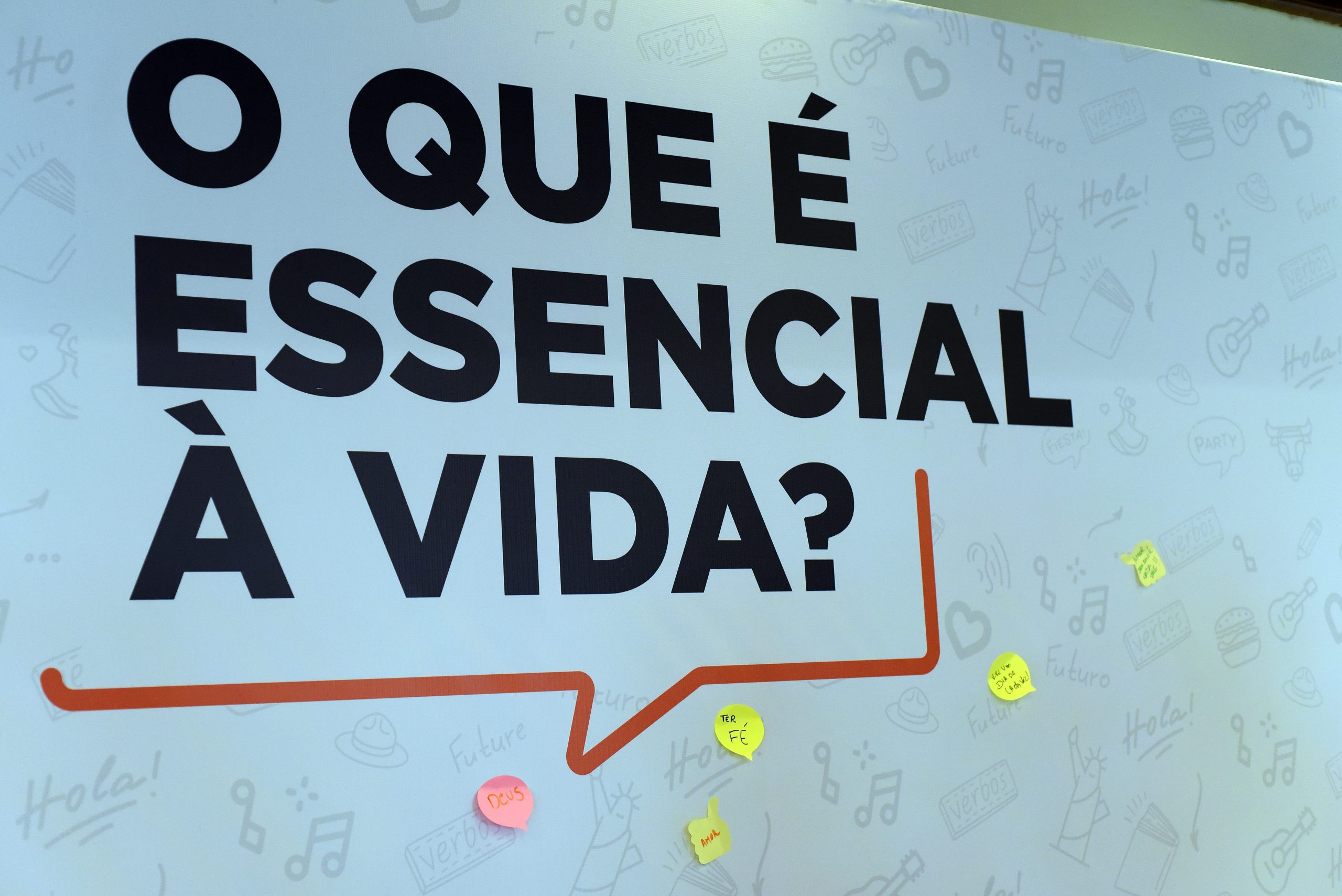 O que é essencial à vida? Um grande mural foi construído a partir do que é essencial para cada um. Sua elaboração foi inspirada nos quadrinhos do Armandinho, em que o personagem diz que o essencial à vida é o amor.