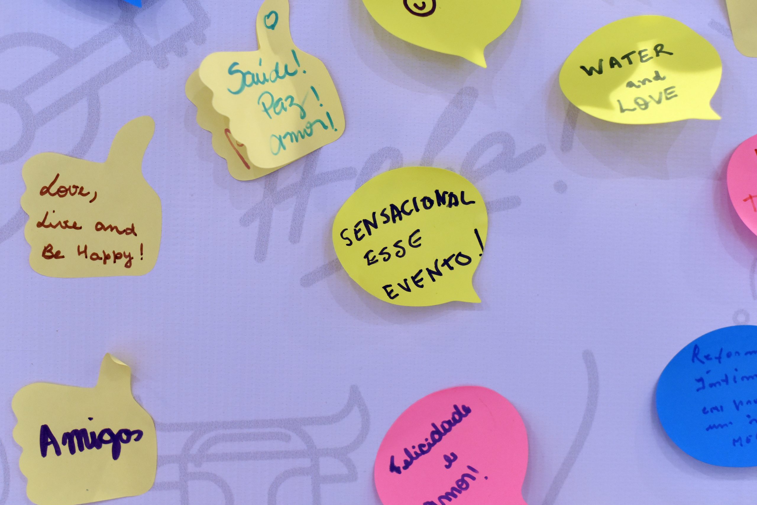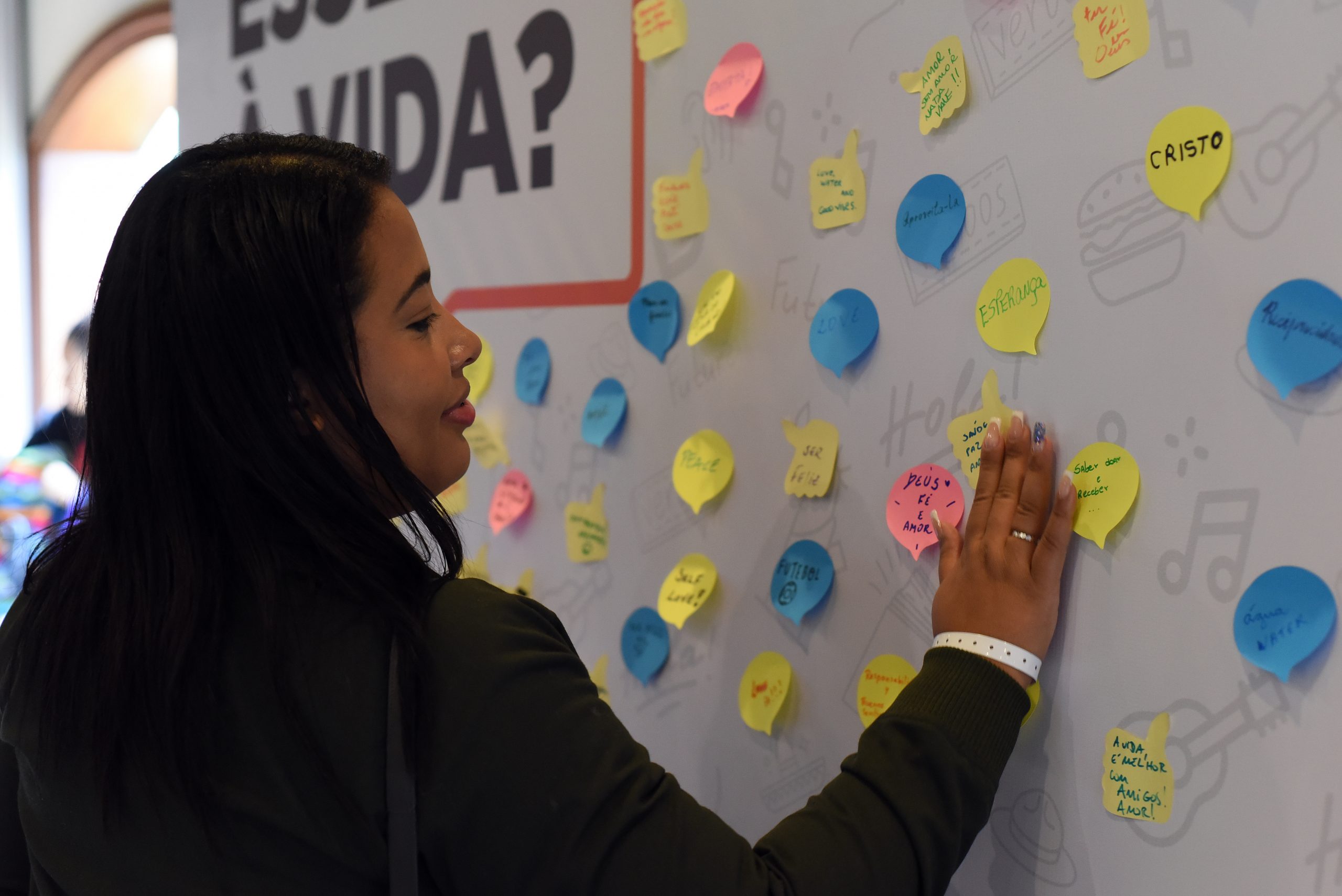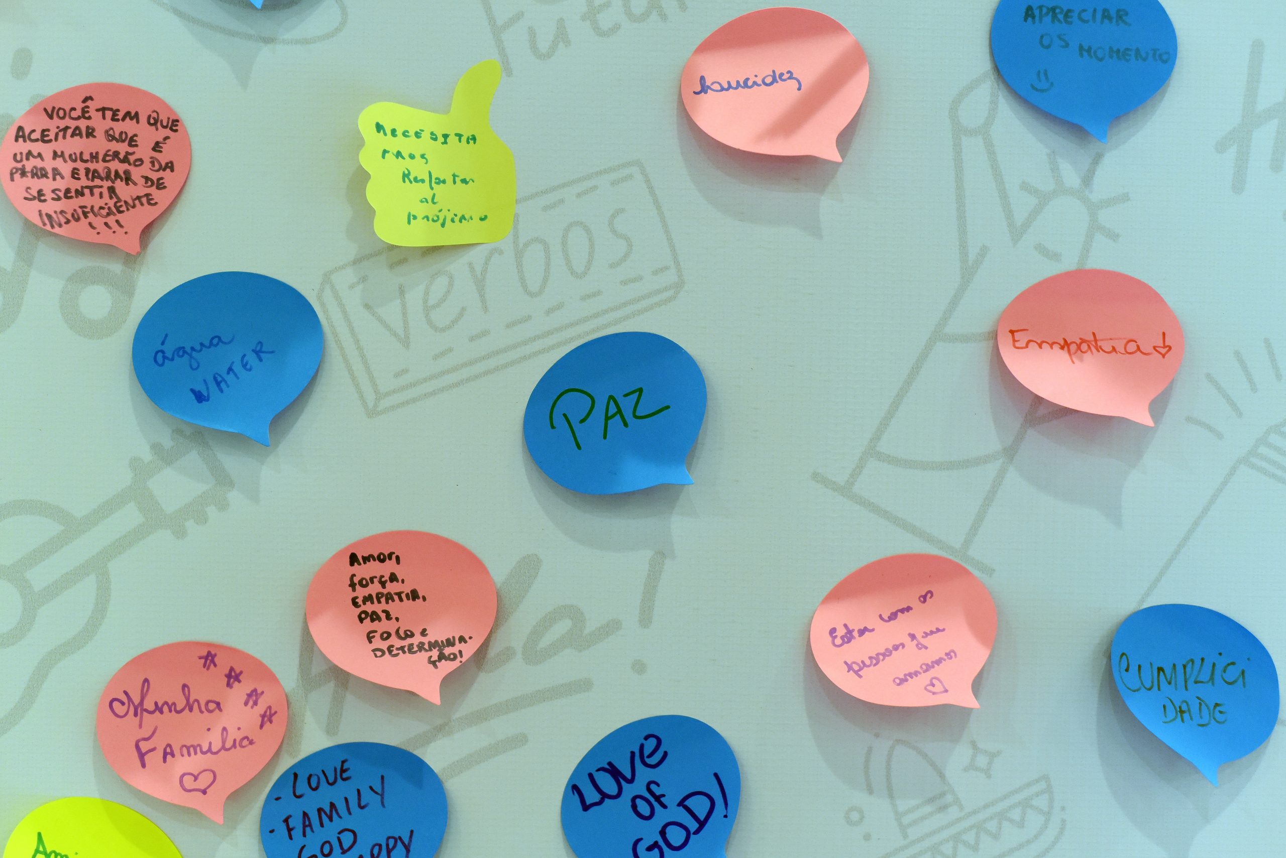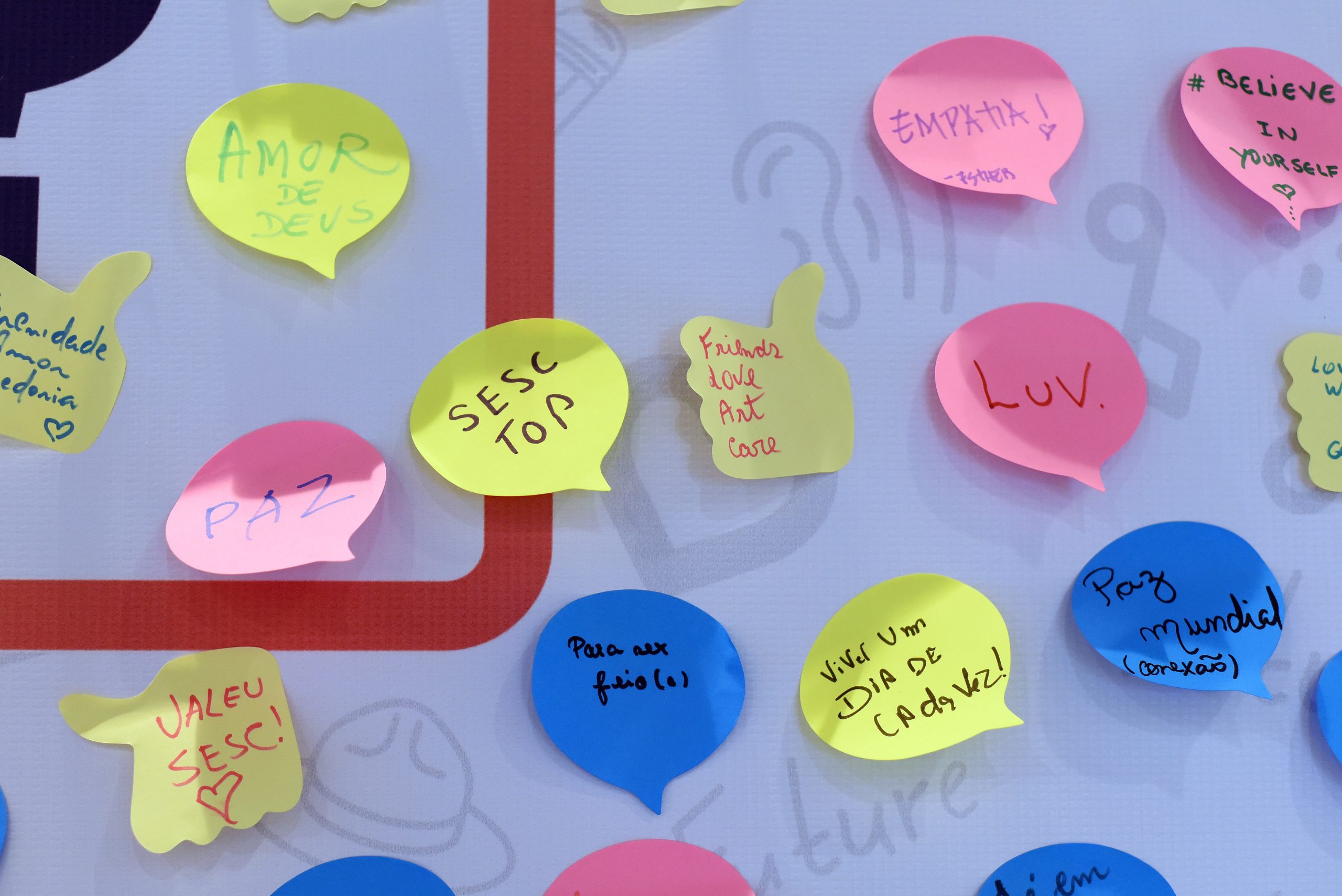 O que é essencial à vida? Um grande mural foi construído a partir do que é essencial para cada um. Sua elaboração foi inspirada nos quadrinhos do Armandinho, em que o personagem diz que o essencial à vida é o amor.