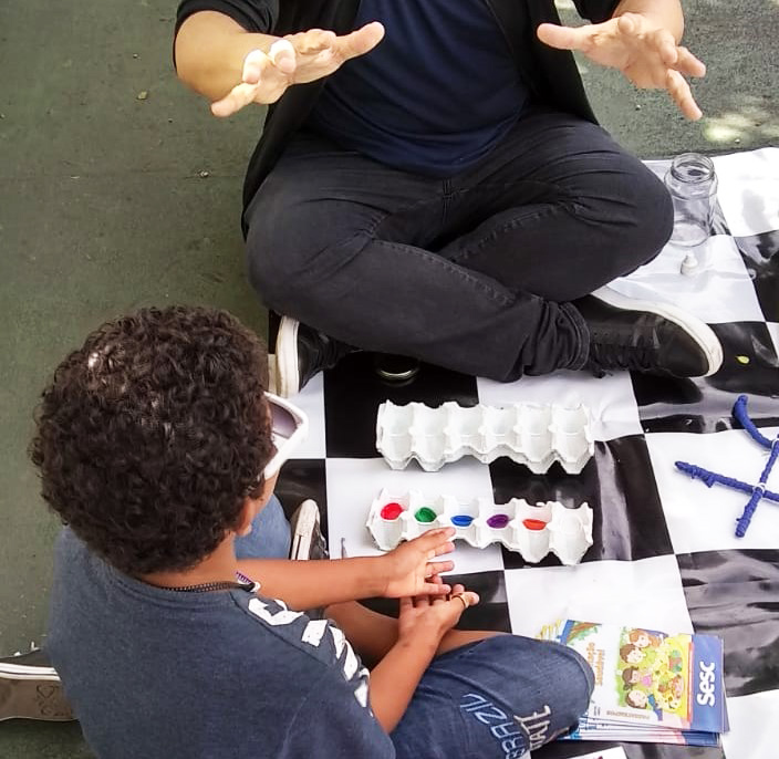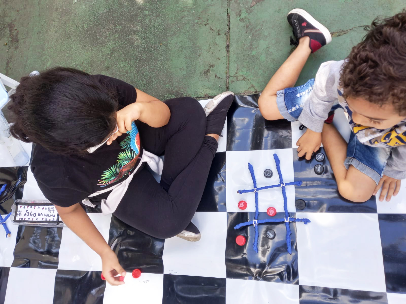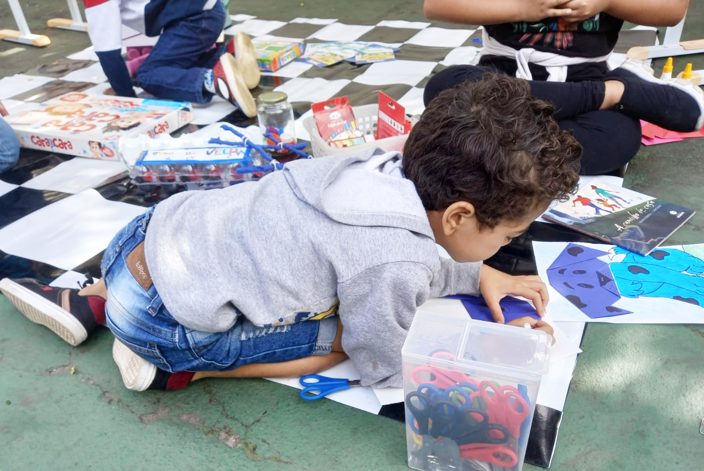 Enquanto aguardavam os atendimentos, as crianças e suas famílias experimentaram o prazer de brincar com os jogos de tabuleiro e os brinquedos construídos pelas crianças participantes do Sesc +Infâncias para esse fim; ouviram histórias e fizeram arte com o professor Rafael Neri e ainda brincaram pelo pátio, expressando-se por meio de gestos e movimentos, com o professor de Educação Física, Glaucio Mendonça.