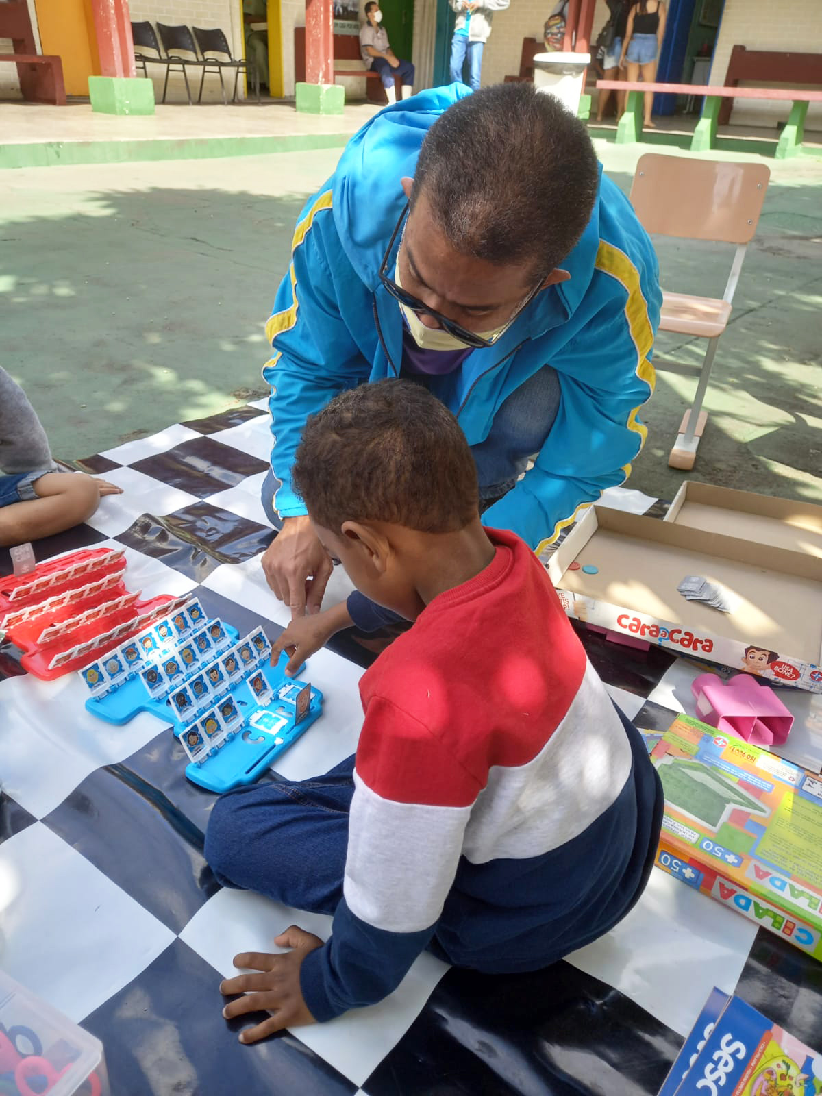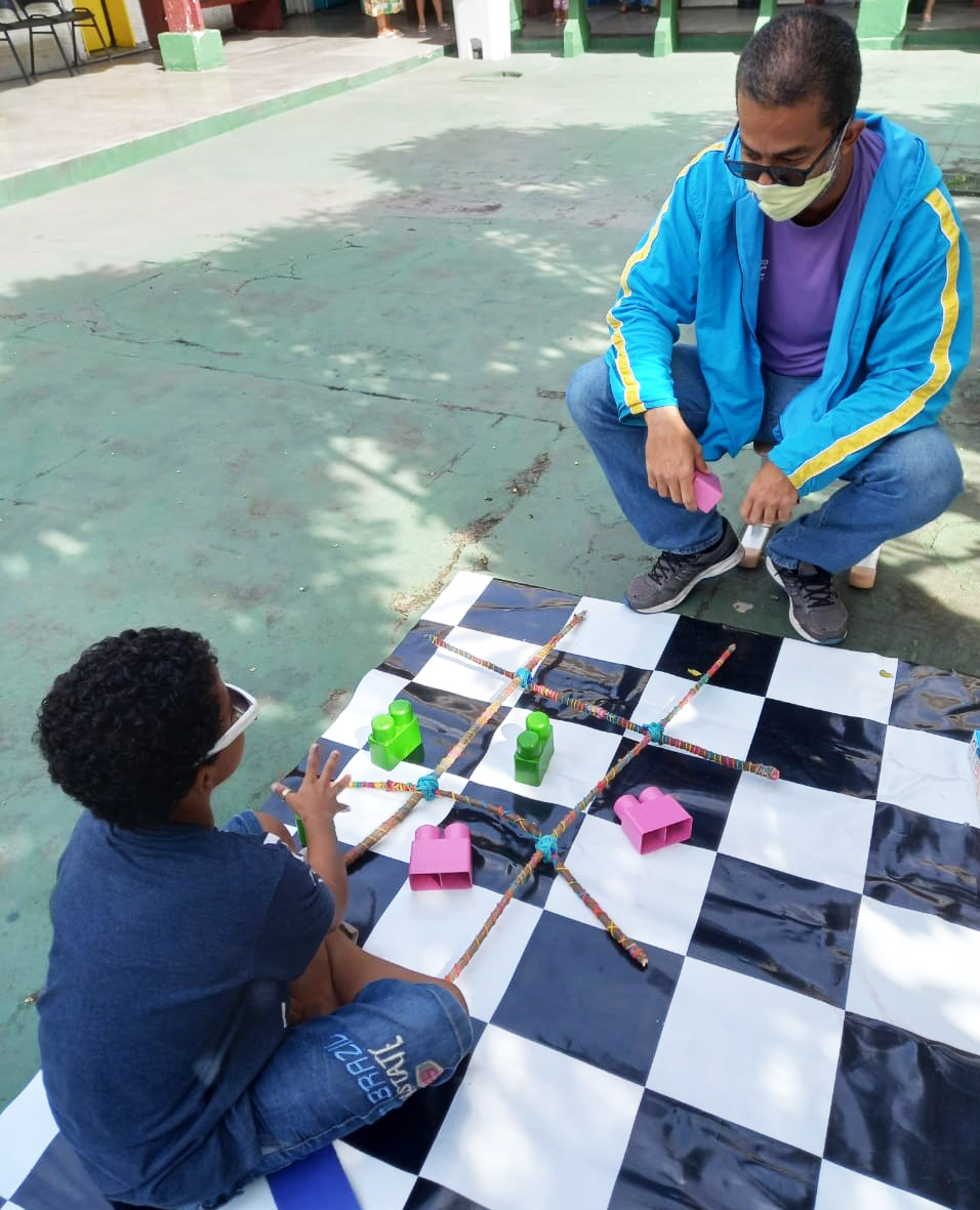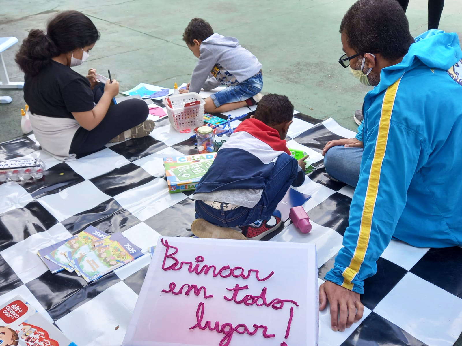 Enquanto aguardavam os atendimentos, as crianças e suas famílias experimentaram o prazer de brincar com os jogos de tabuleiro e os brinquedos construídos pelas crianças participantes do Sesc +Infâncias para esse fim; ouviram histórias e fizeram arte com o professor Rafael Neri e ainda brincaram pelo pátio, expressando-se por meio de gestos e movimentos, com o professor de Educação Física, Glaucio Mendonça.