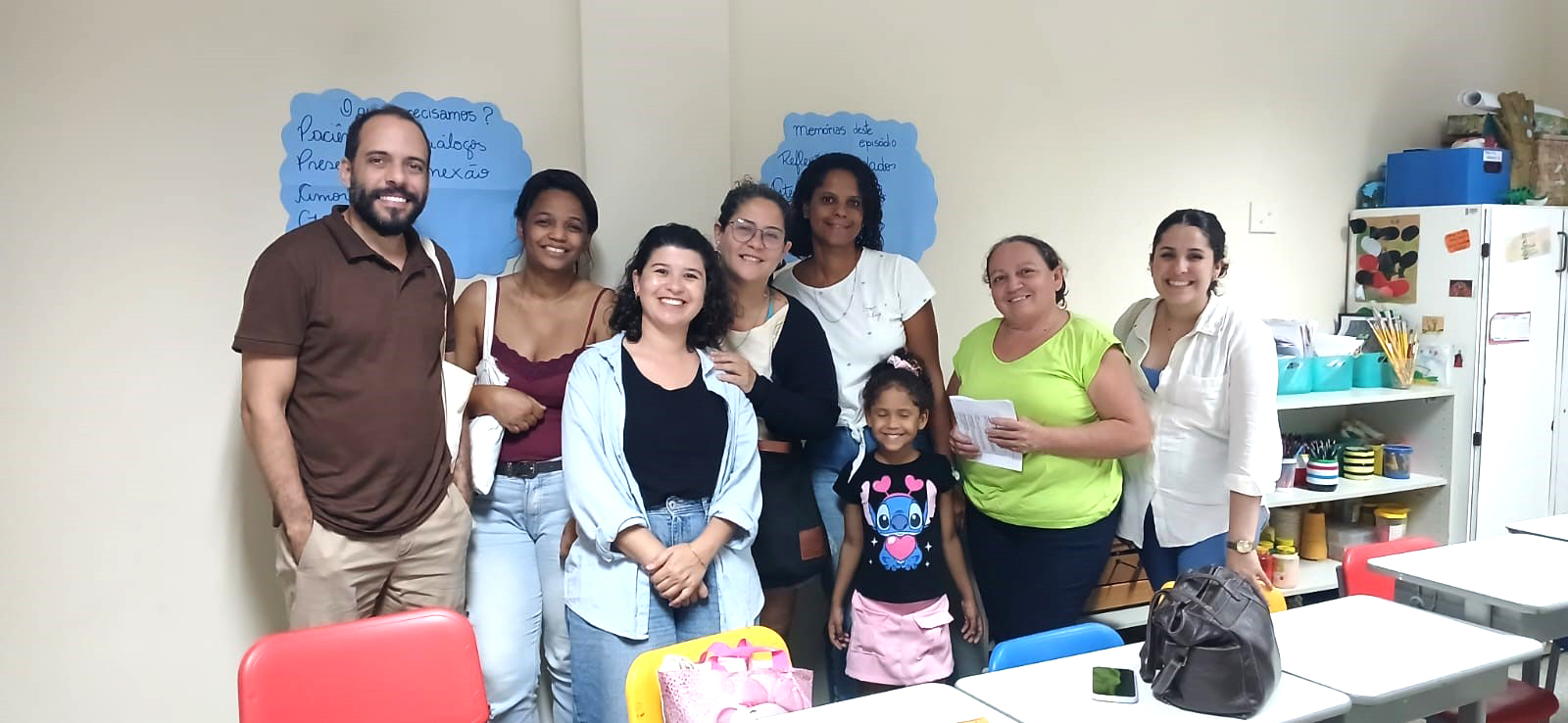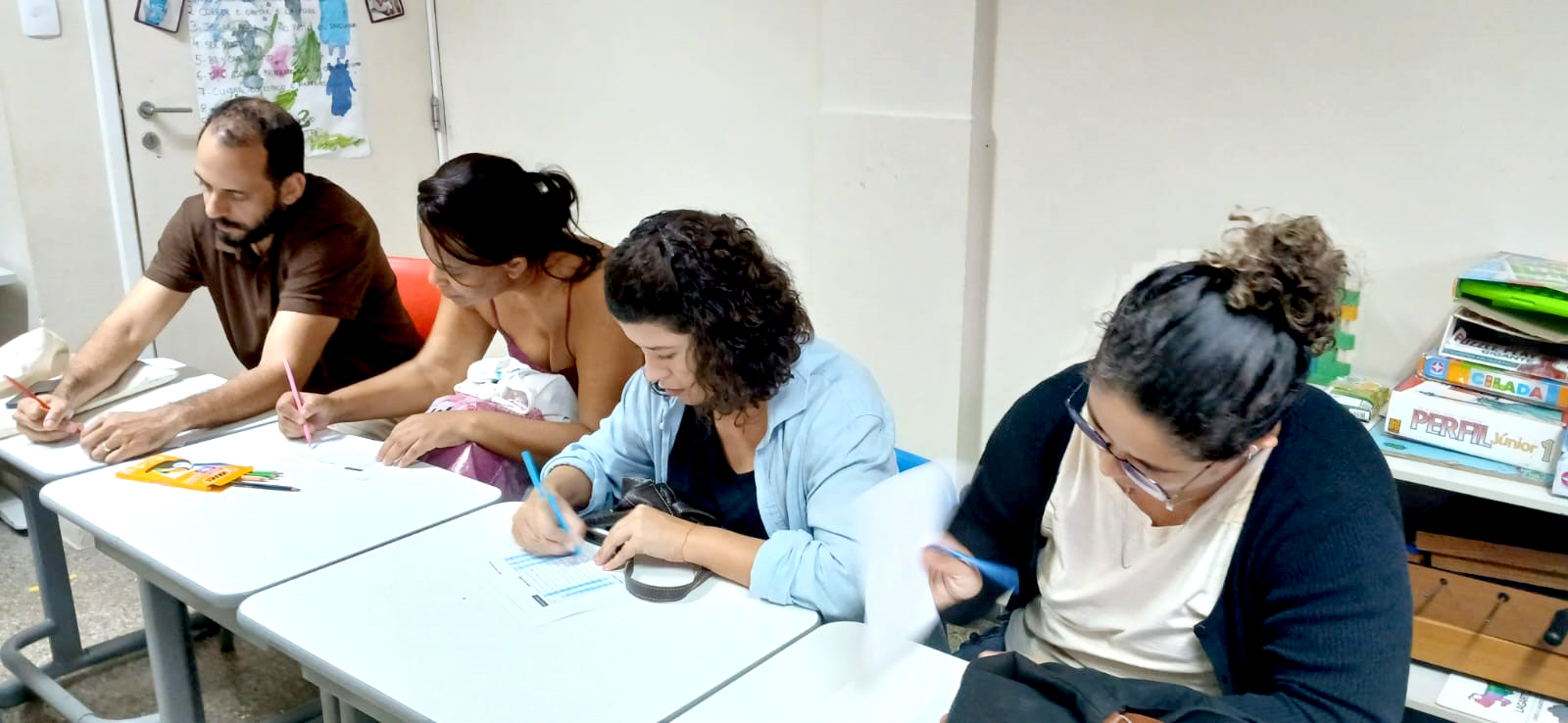 A tarde começou ao som de Milton, conduzindo os participantes a revisitar memórias desde a descoberta da gravidez, passando pelo nascimento e chegando ao chão da escola. Entre lembranças, expectativas e receios, as famílias compartilharam as responsabilidades assumidas com a chegada dos filhos, construindo um espaço de acolhimento e reconhecimento mútuo.