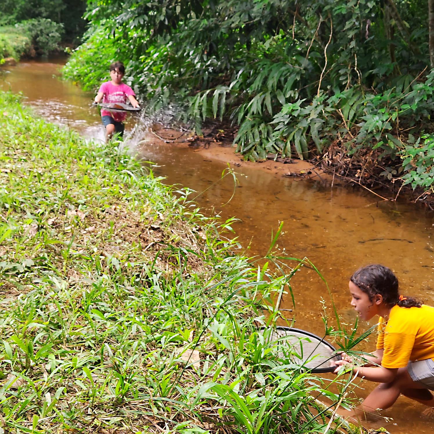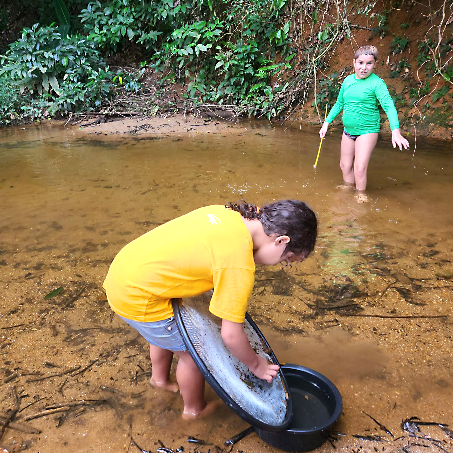 As crianças também participaram de uma atividade de pesca com peneira no riacho, vivenciando a captura e a soltura de peixinhos e girinos, em alusão às histórias contadas. A experiência reforçou a importância da preservação do ecossistema local e estimulou a curiosidade científica, despertando o interesse pela pesquisa em campo.