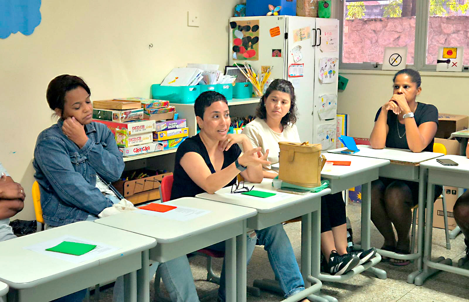 Os responsáveis também participaram de uma dinâmica interativa: cartões com frases desafiadoras — comuns na fala das crianças — foram utilizados para estimular a construção coletiva de estratégias que apoiem a vivência escolar e fortaleçam o vínculo entre casa e escola.