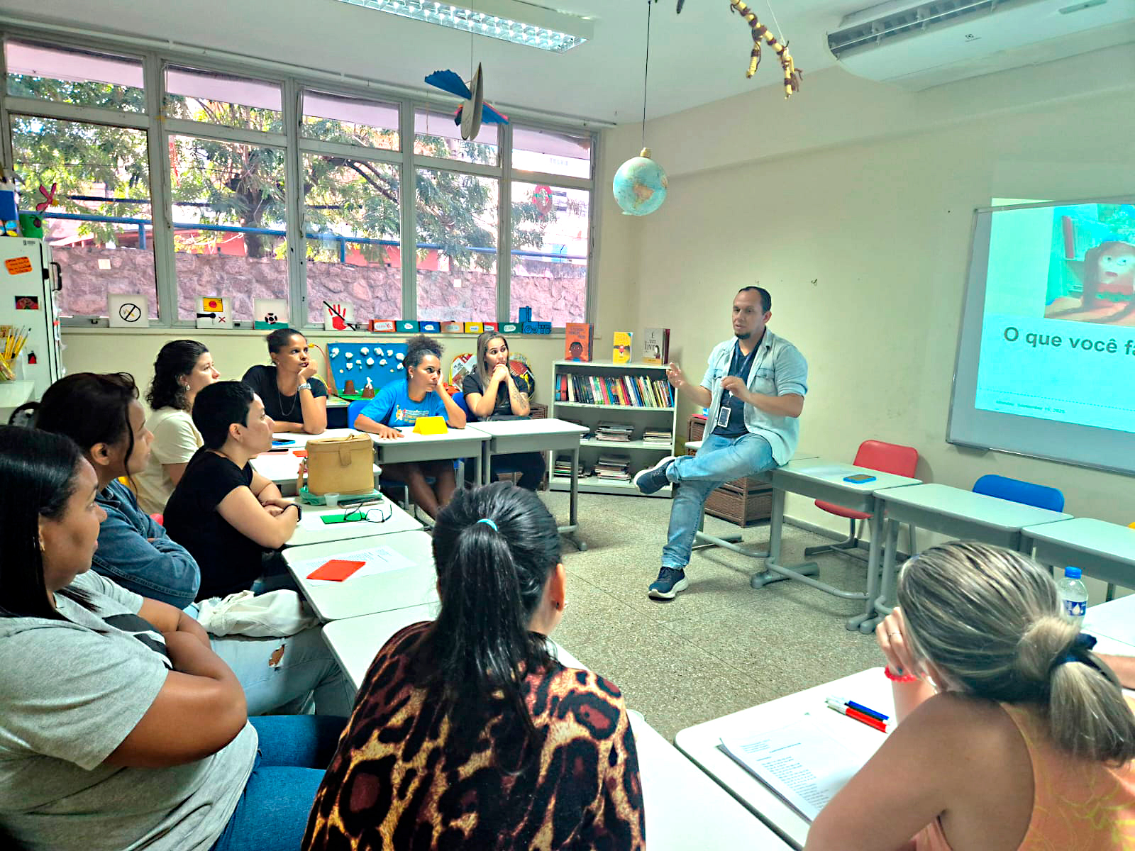 A tarde começou ao som de Milton, conduzindo os participantes a revisitar memórias desde a descoberta da gravidez, passando pelo nascimento e chegando ao chão da escola. Entre lembranças, expectativas e receios, as famílias compartilharam as responsabilidades assumidas com a chegada dos filhos, construindo um espaço de acolhimento e reconhecimento mútuo.