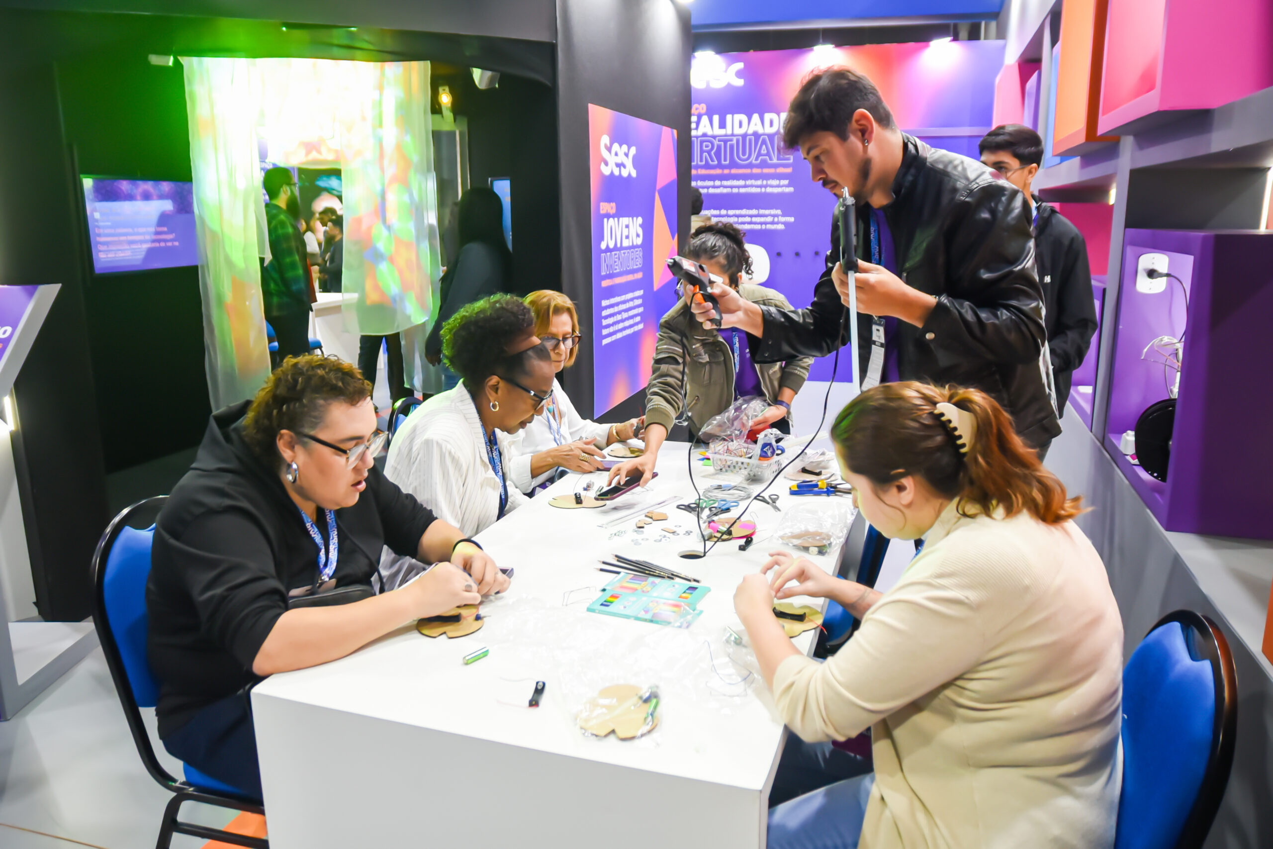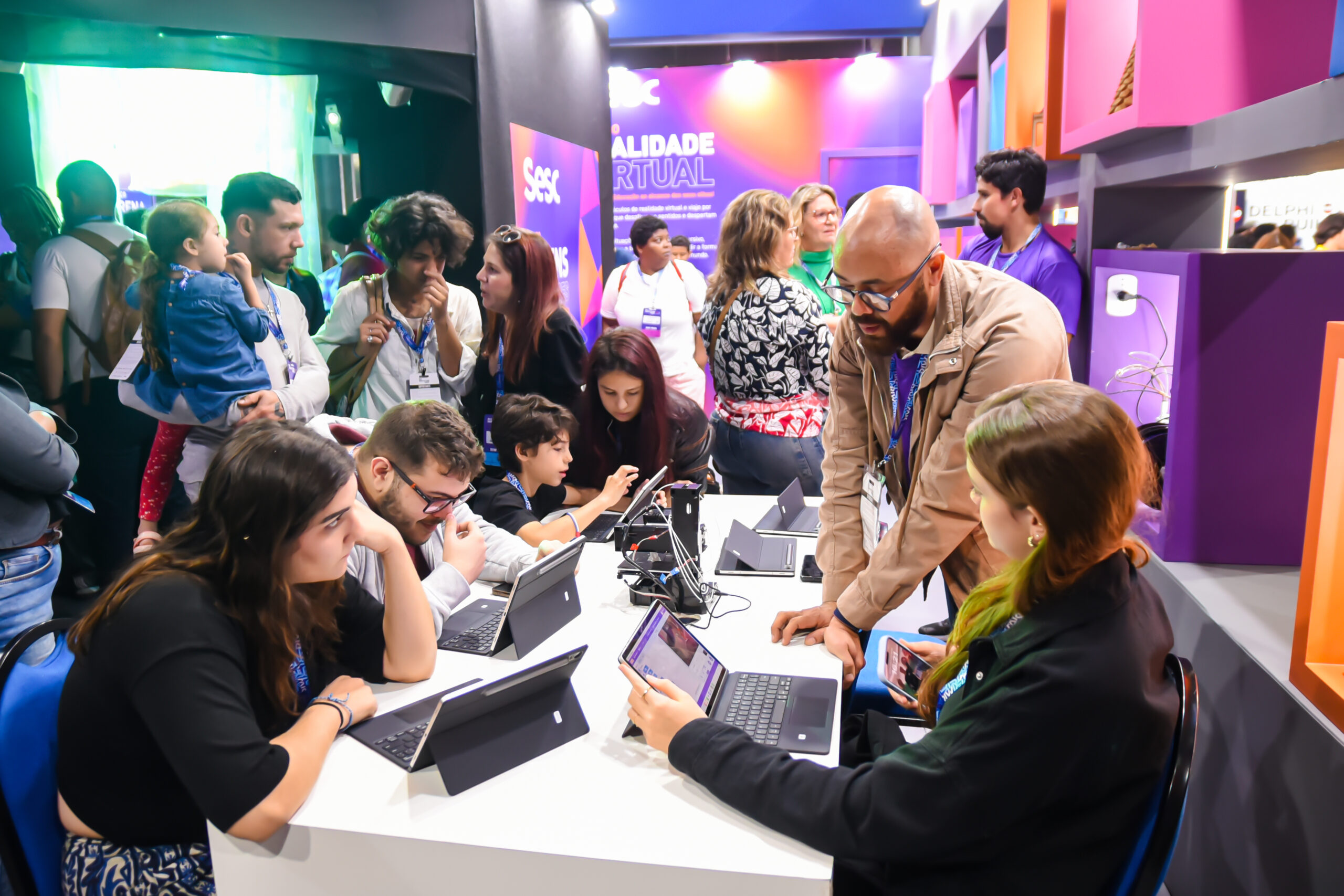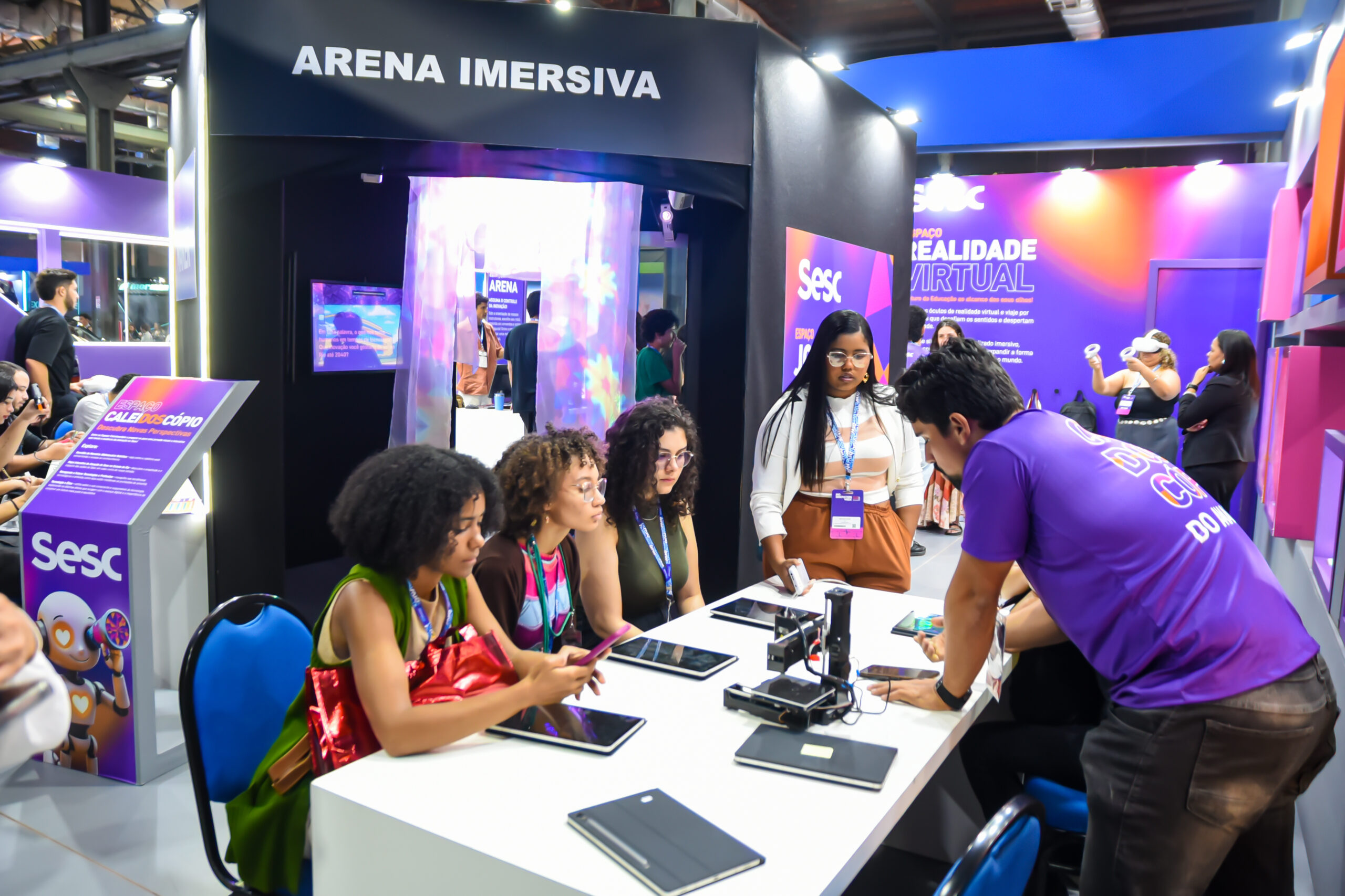 A equipe do Sesc RJ, representada por Adriano Rocha, Diogo de Toledo, Carolina Moreira, Fabiana Villar e Maria Antônia Goulart, participou de cinco painéis realizados no Armazém do Kobra, no Palco Edutech. Os debates abordaram temáticas que relacionavam educação, tecnologia e bem-estar social.