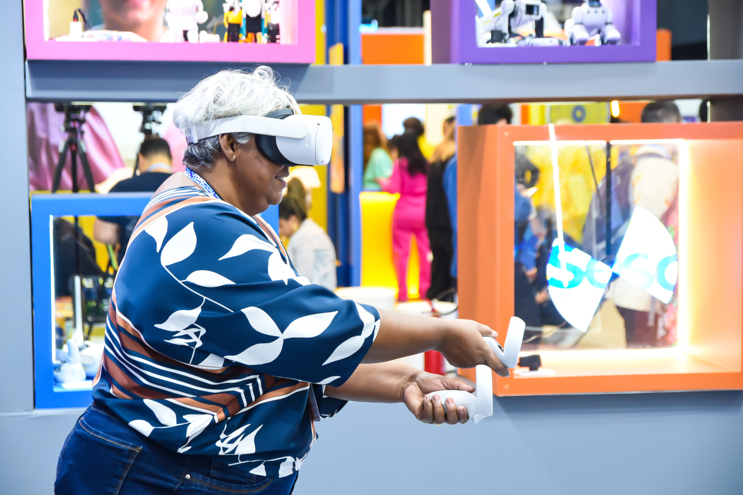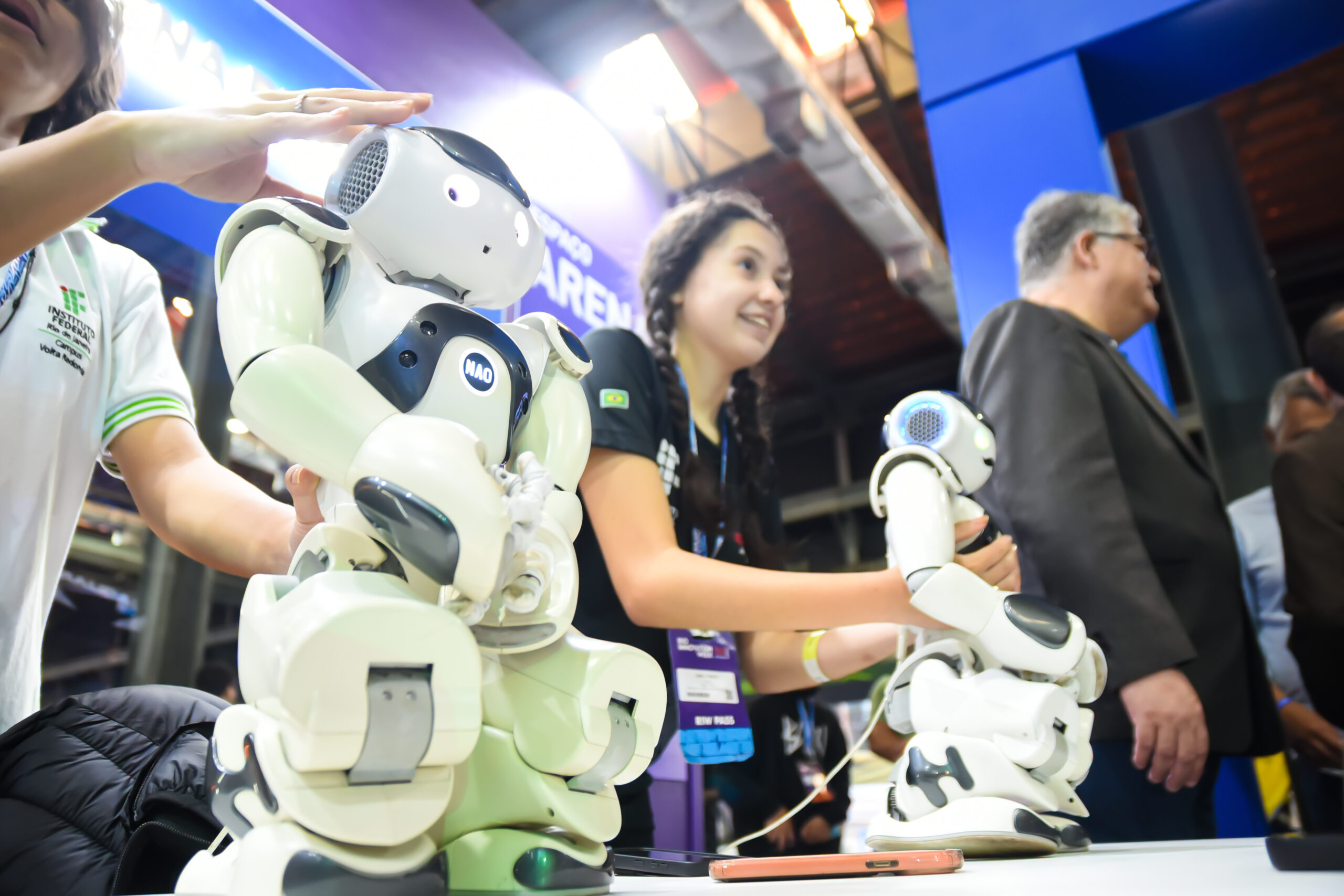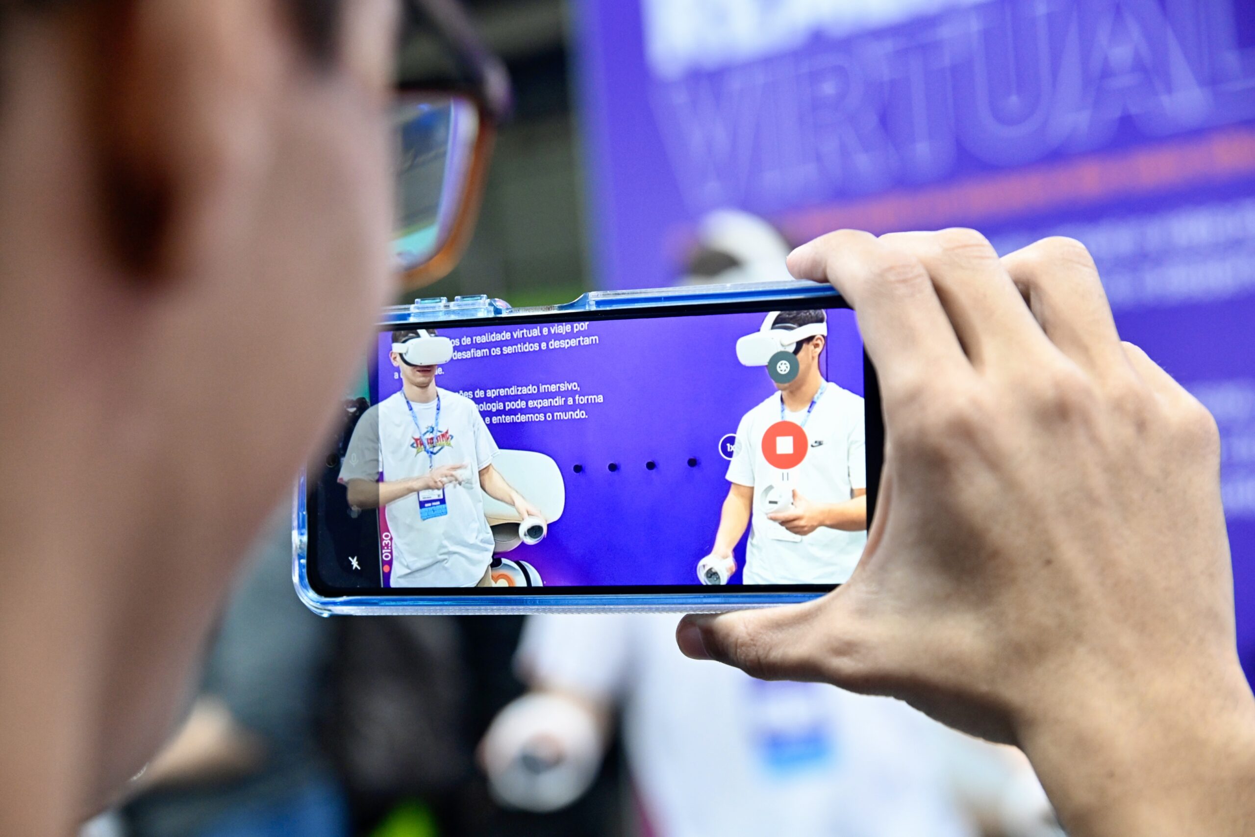 Com óculos de realidade virtual, os visitantes assumiram o papel de operadores de robôs em ambientes simulados, vivenciando de forma lúdica os desafios de carreiras emergentes ligadas à operação remota de máquinas no mundo digital.