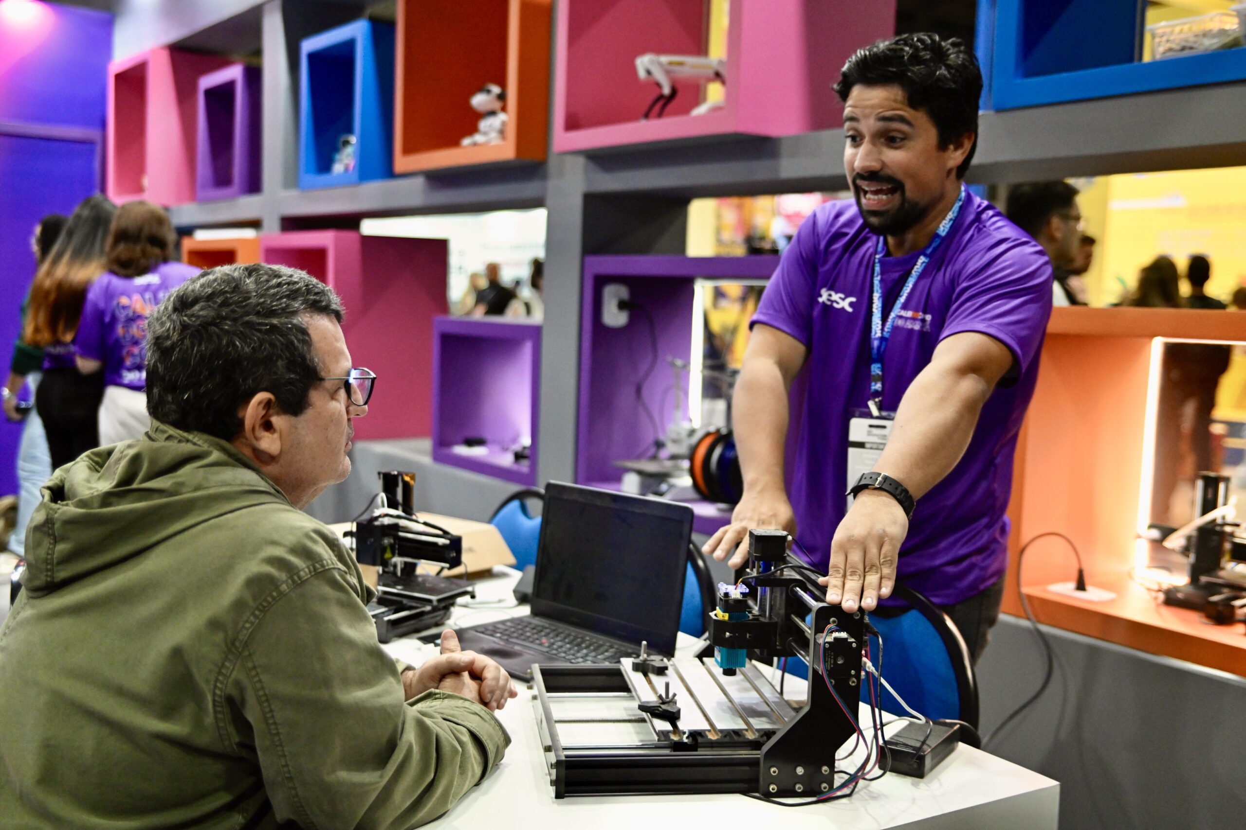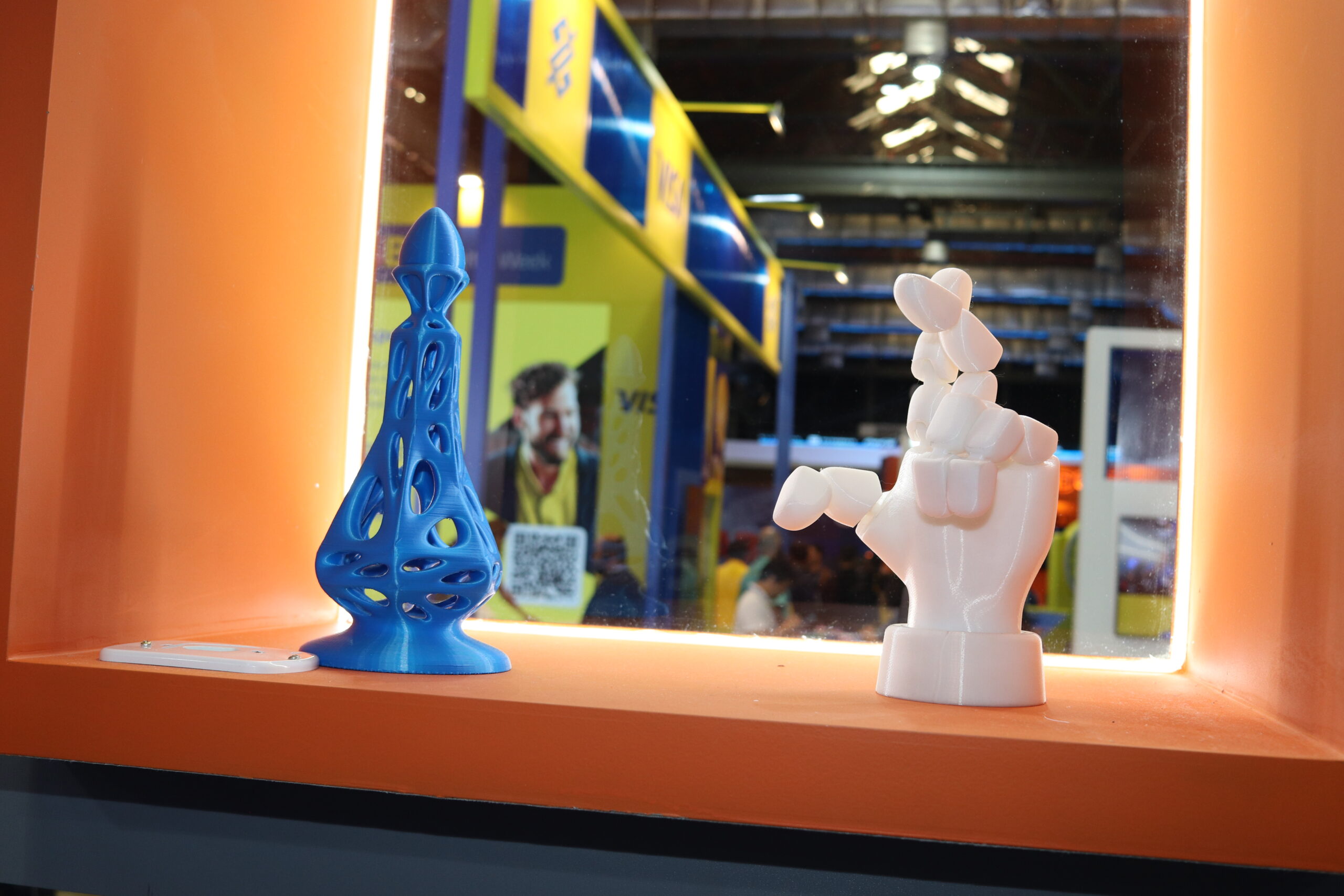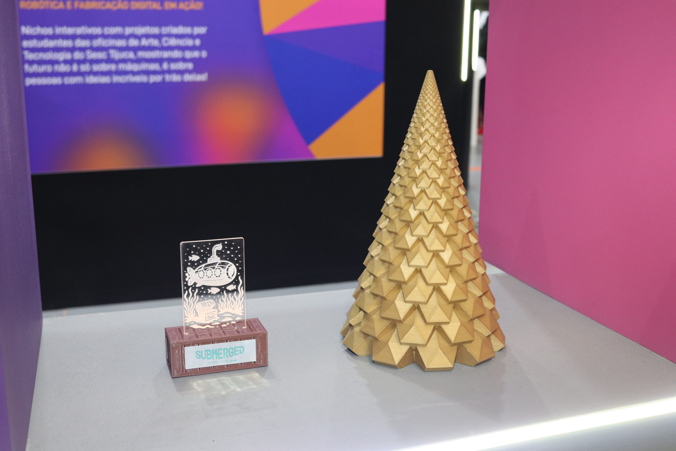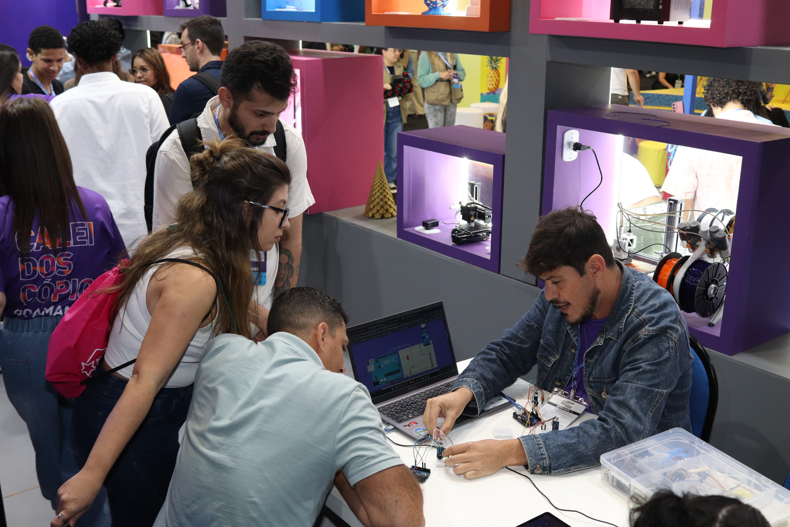 Vitrines acessíveis por dentro e por fora do estande exibiam impressoras 3D em funcionamento contínuo, além de protótipos desenvolvidos por estudantes e entusiastas, despertando a imaginação do público.