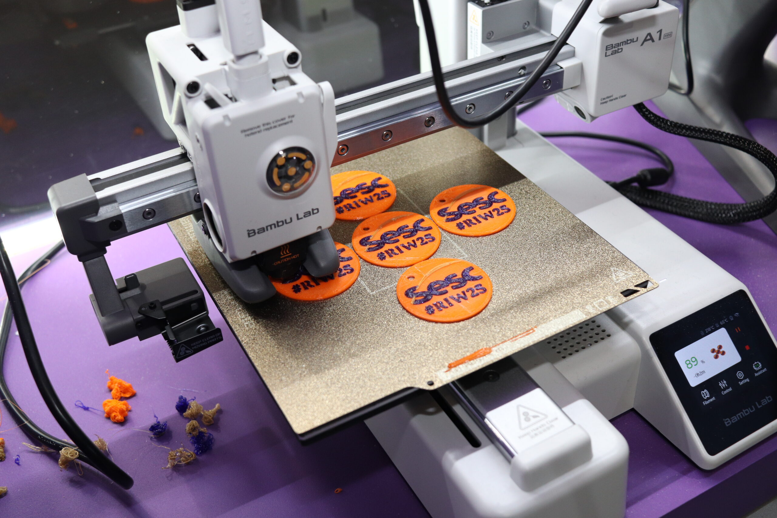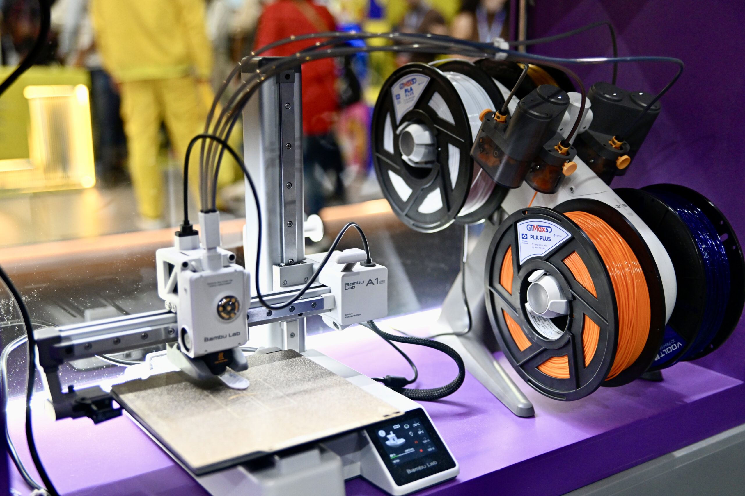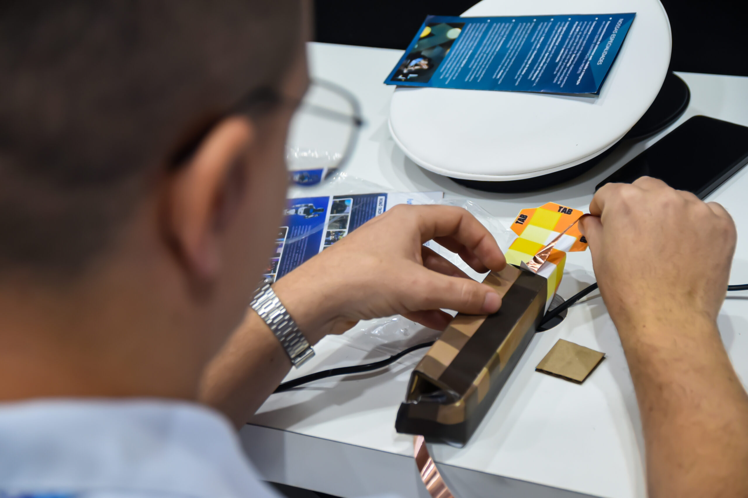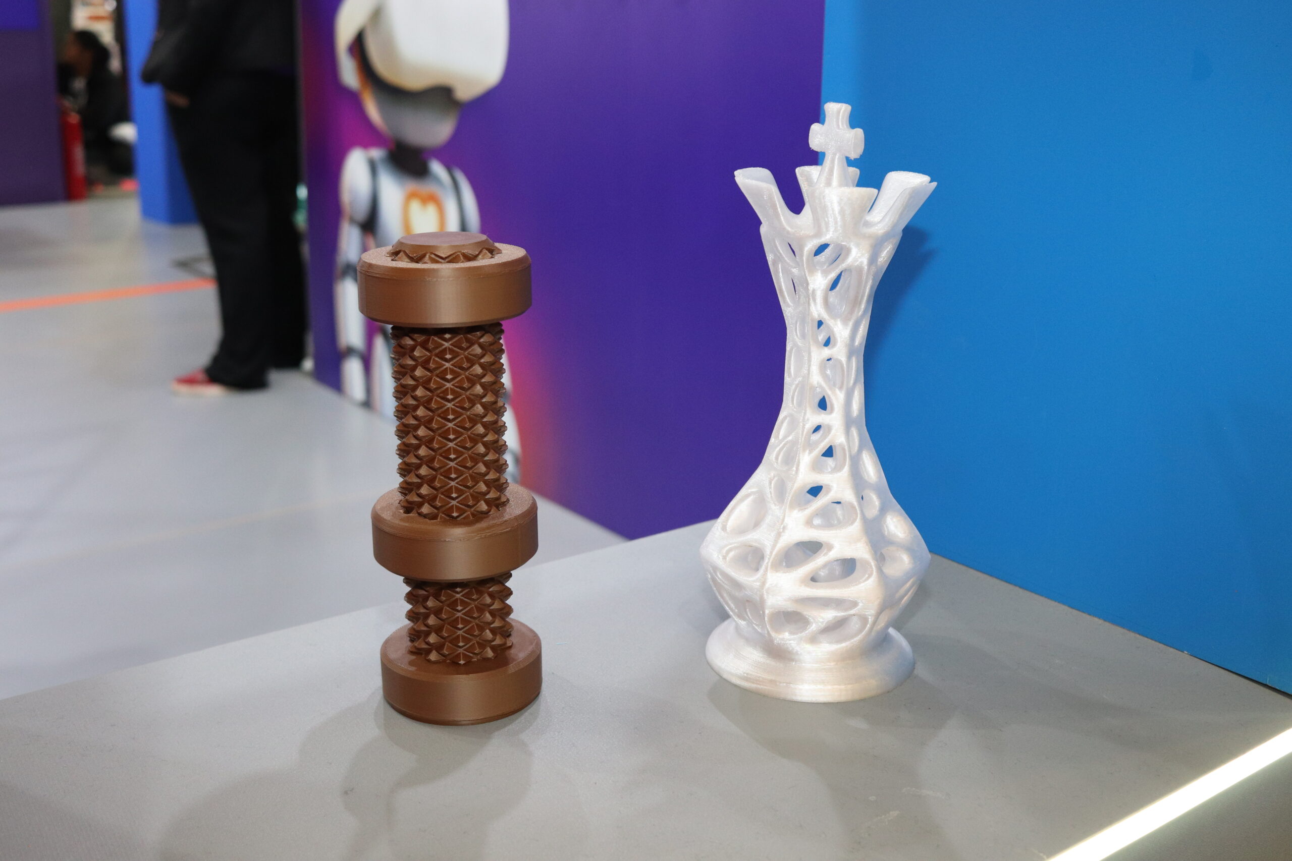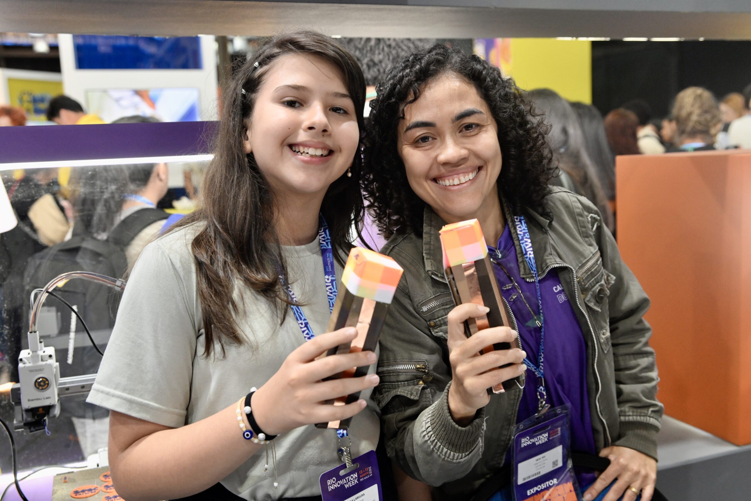 Vitrines acessíveis por dentro e por fora do estande exibiam impressoras 3D em funcionamento contínuo, além de protótipos desenvolvidos por estudantes e entusiastas, despertando a imaginação do público.