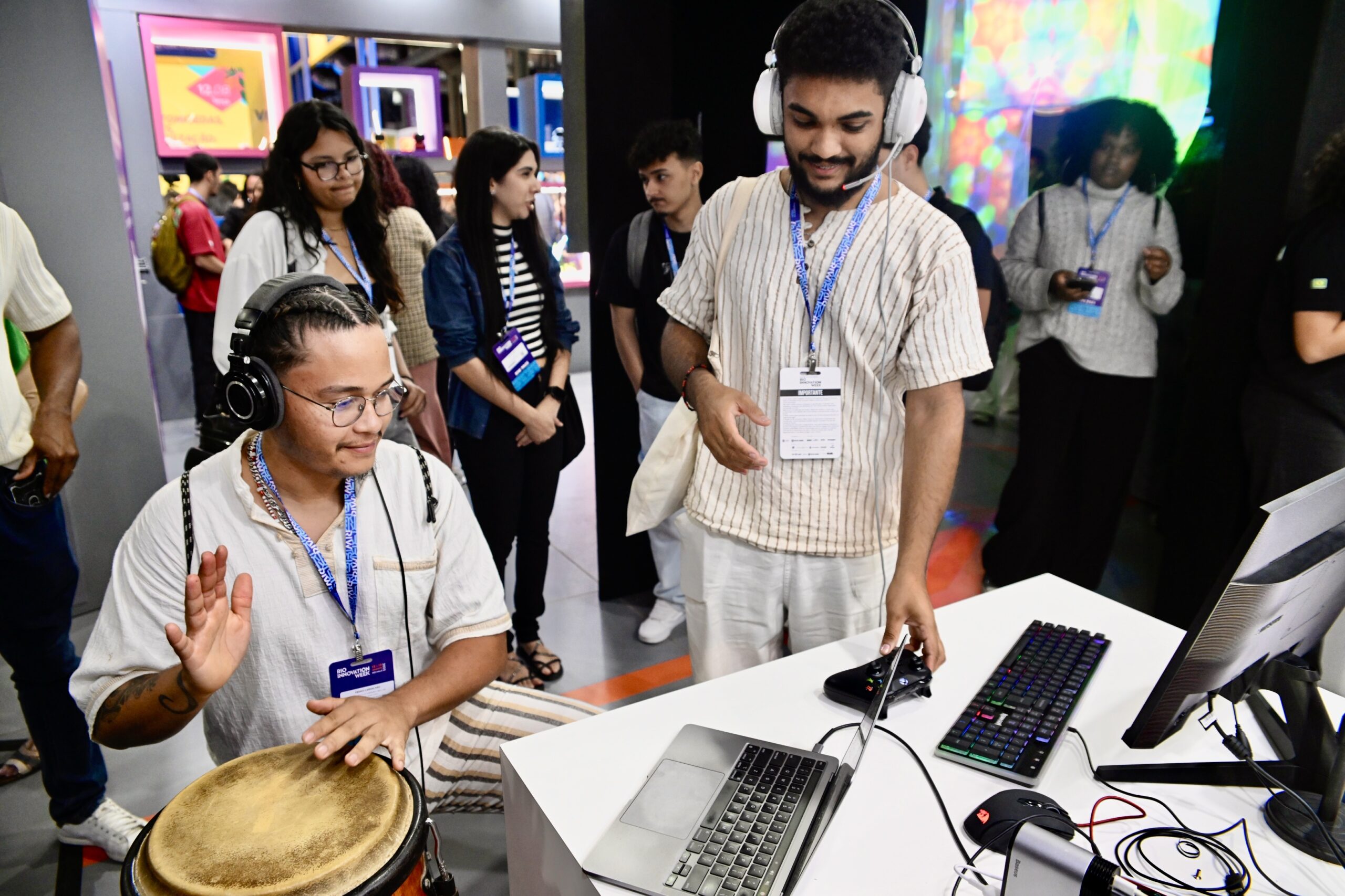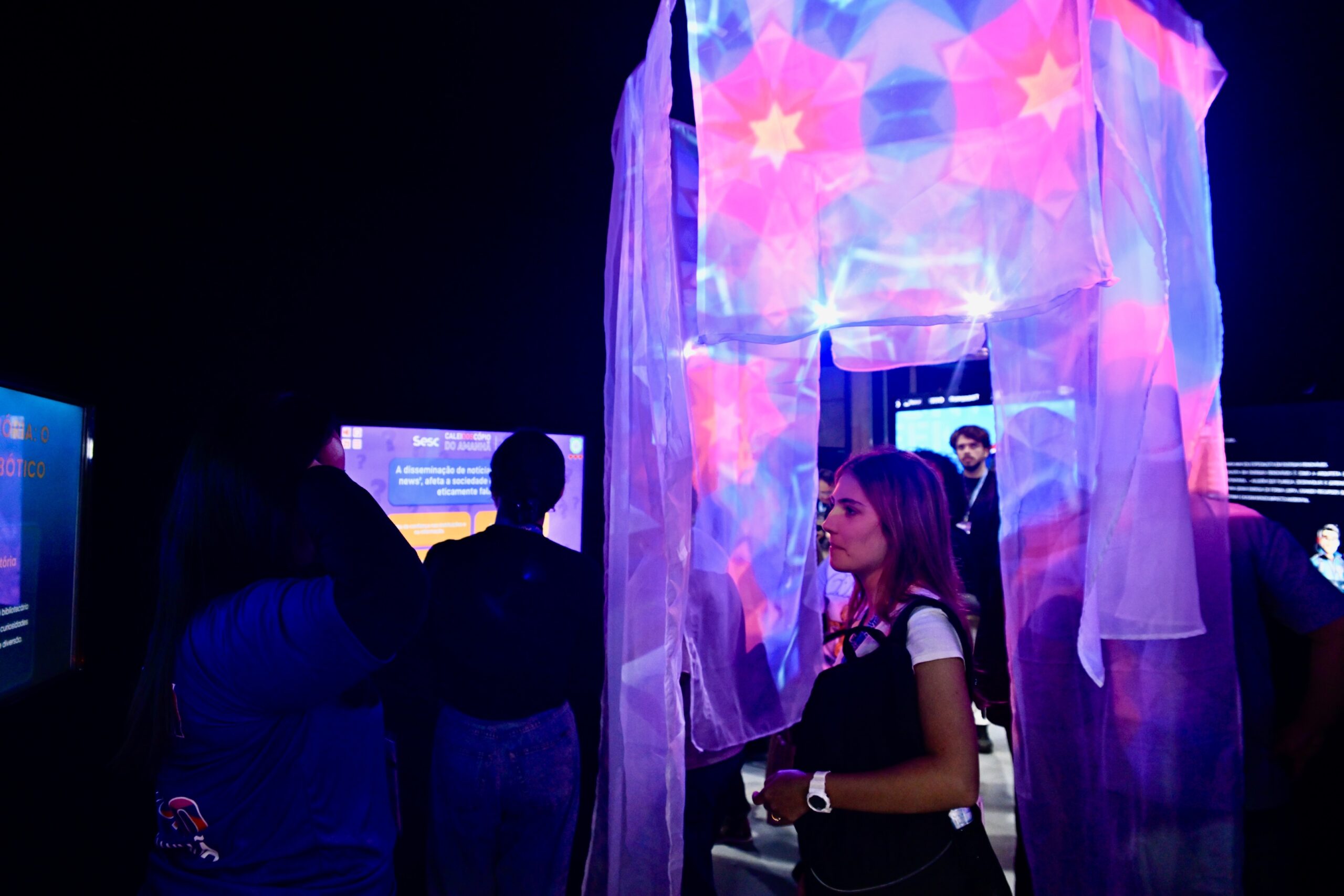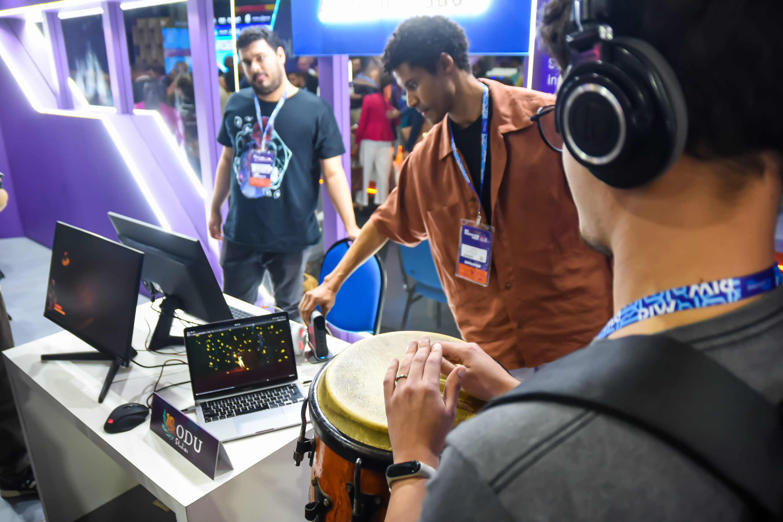 Espaço dedicado à gamificação, robótica e memória, onde ritmos e sensores “contavam” histórias ancestrais. Foi contabilizada uma quantidade expressiva de experimentos por dia, via dashboard, revelando o interesse do público pela relação entre tecnologia e ancestralidade.