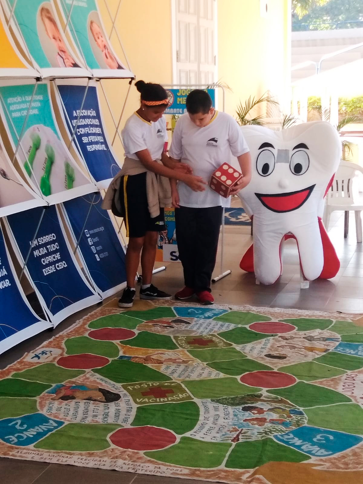 Tapete de vacinas, jogo da memória (dengue e saúde bucal) e modelo Hiperbocão fizeram parte das brincadeiras sobre saúde.