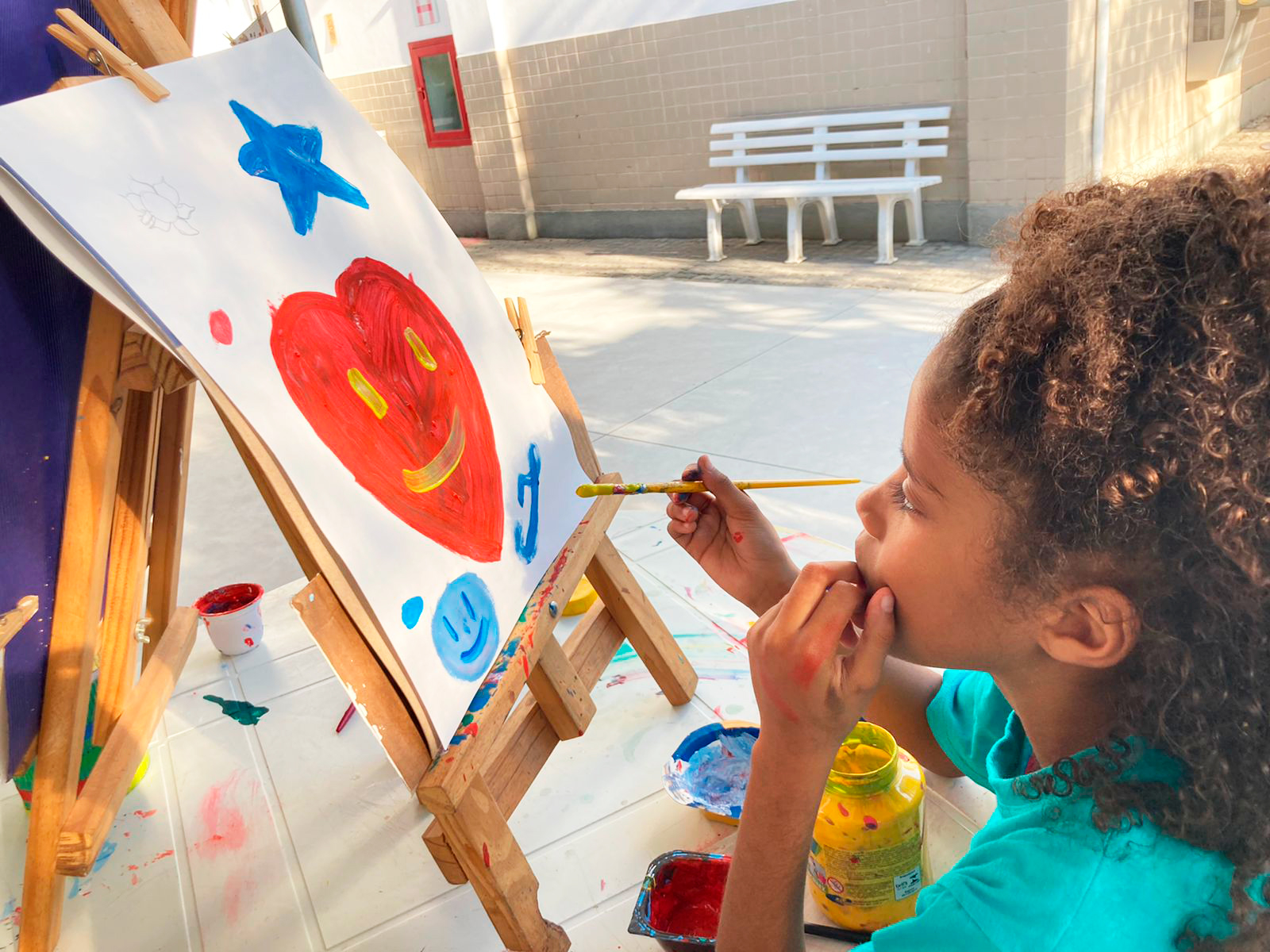 Durante o caminho até a unidade, as ruas estavam caracterizadas com amarelinha, malhas, crianças e famílias estavam com bolhas de sabão nas mãos.