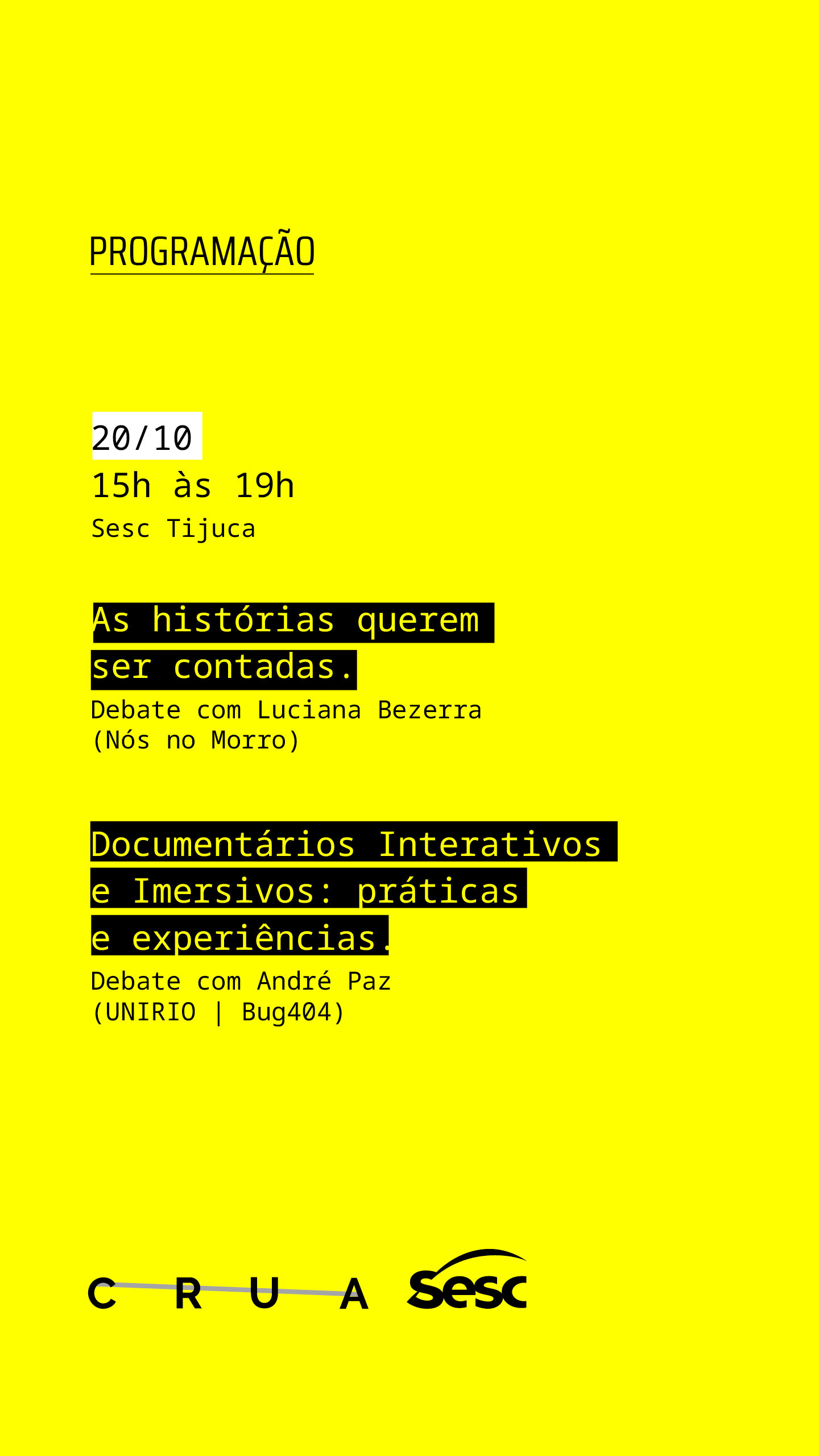 Dia 1: Imersão Teórica 20 de outubro (SESC Tijuca) 15h - Apresentação do Workshop. Com Gabriela Pascal e Sophia Pinheiro. 15h30 - Roteiro, personagens e trajetórias. Palestra com debate. Com Luciana Bezerra / Nós do Morro. Mediadora: Sophia Pinheiro 17h - Intervalo 17h30 - Documentário interativo e narrativas de imersão. Palestra com debate. Com André Paz. Mediadora: Sophia Pinheiro.