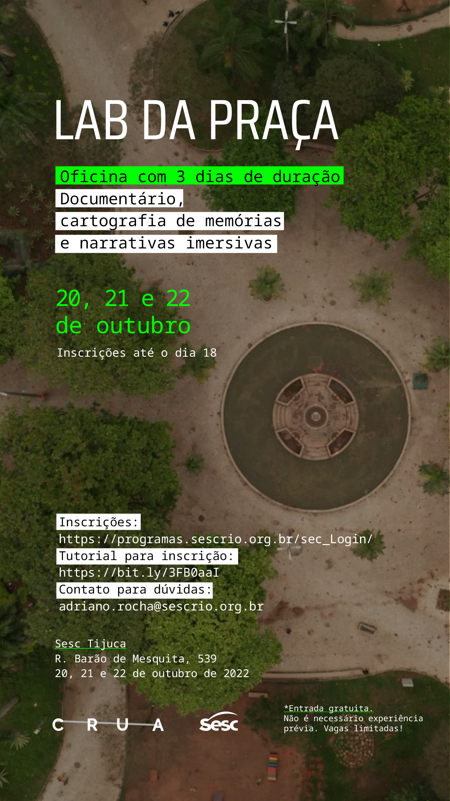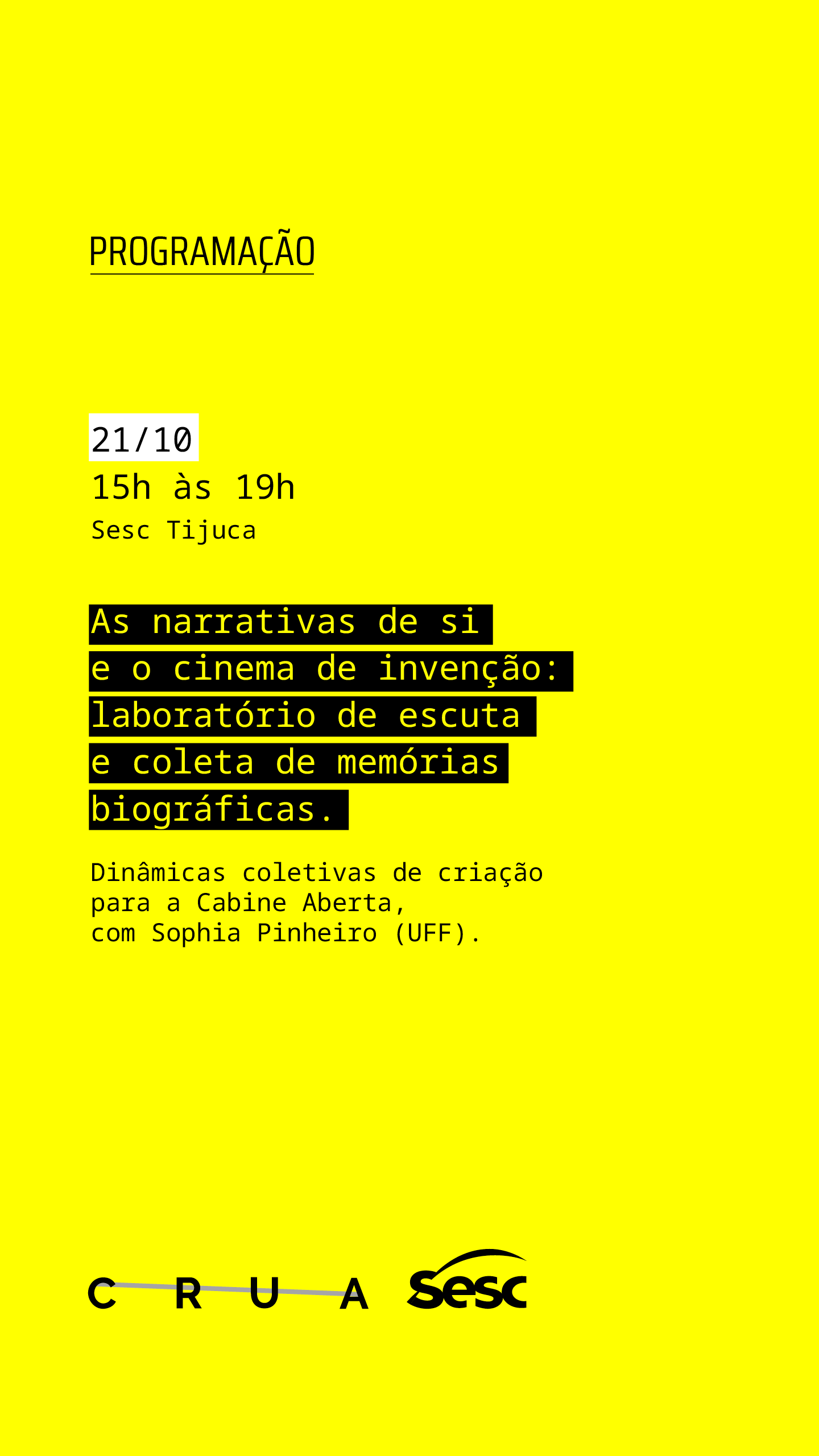 Dia 2: Escuta de Narrativas do território 21 de outubro (SESC Tijuca) 15h - Apresentação da Pesquisa do Webdoc Osório. Com Miriam Struz. 16h - Narrativas de si - Laboratório de escutas - Parte I. Com Sophia Pinheiro. Sesc Tijuca. 17h - Intervalo 17h30 - Narrativas de si - Laboratório de escutas - Parte II. Com Sophia Pinheiro. Encerramento: orientações sobre o dia seguinte. Com Sophia Pinheiro.