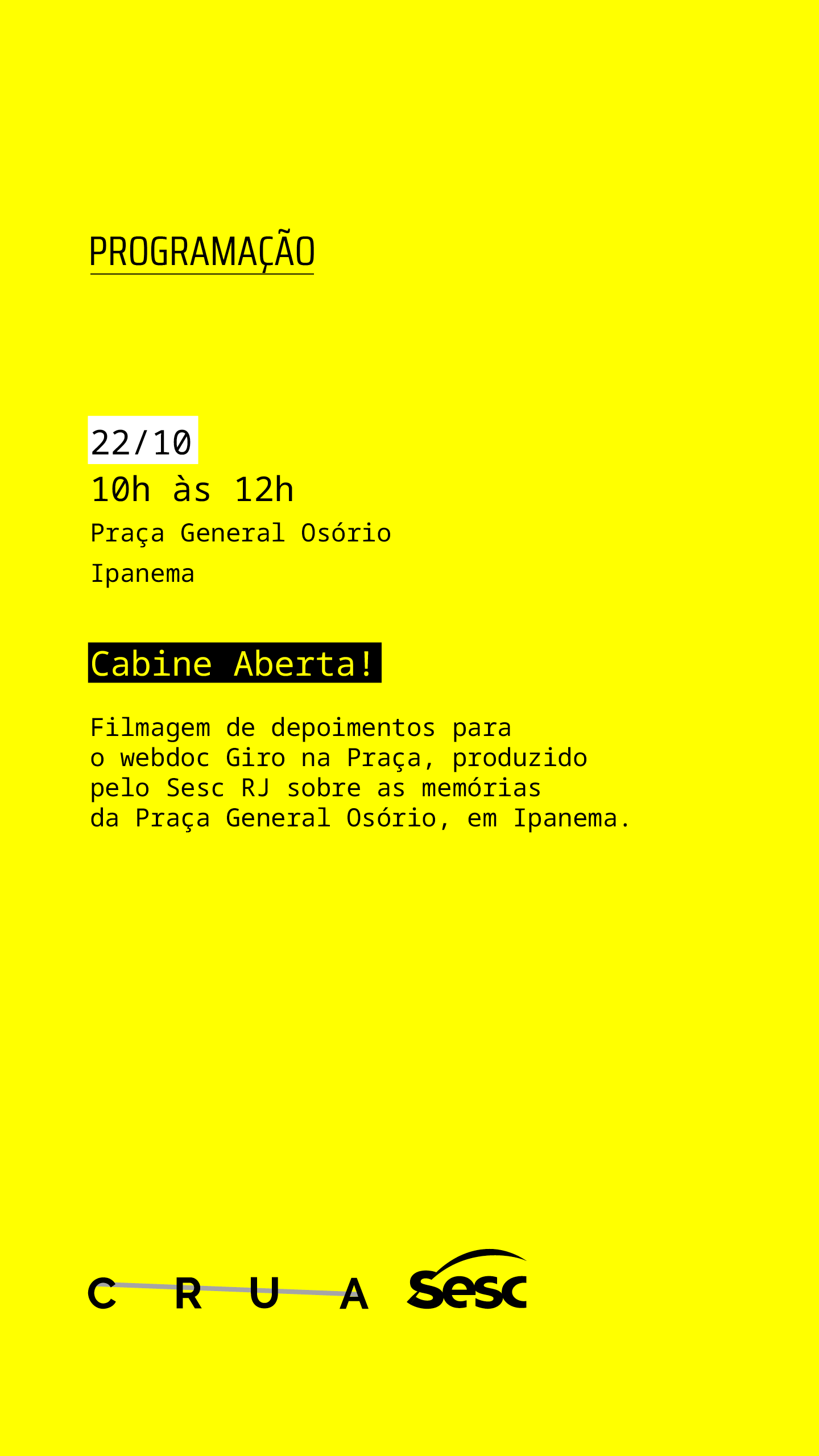 Dia 3: Cabine Aberta na Praça 22 de outubro (Local: Praça General Osório) 9h - Cabine Aberta com Sophia Pinheiro, Gabriela Pascal e equipe de filmagem.